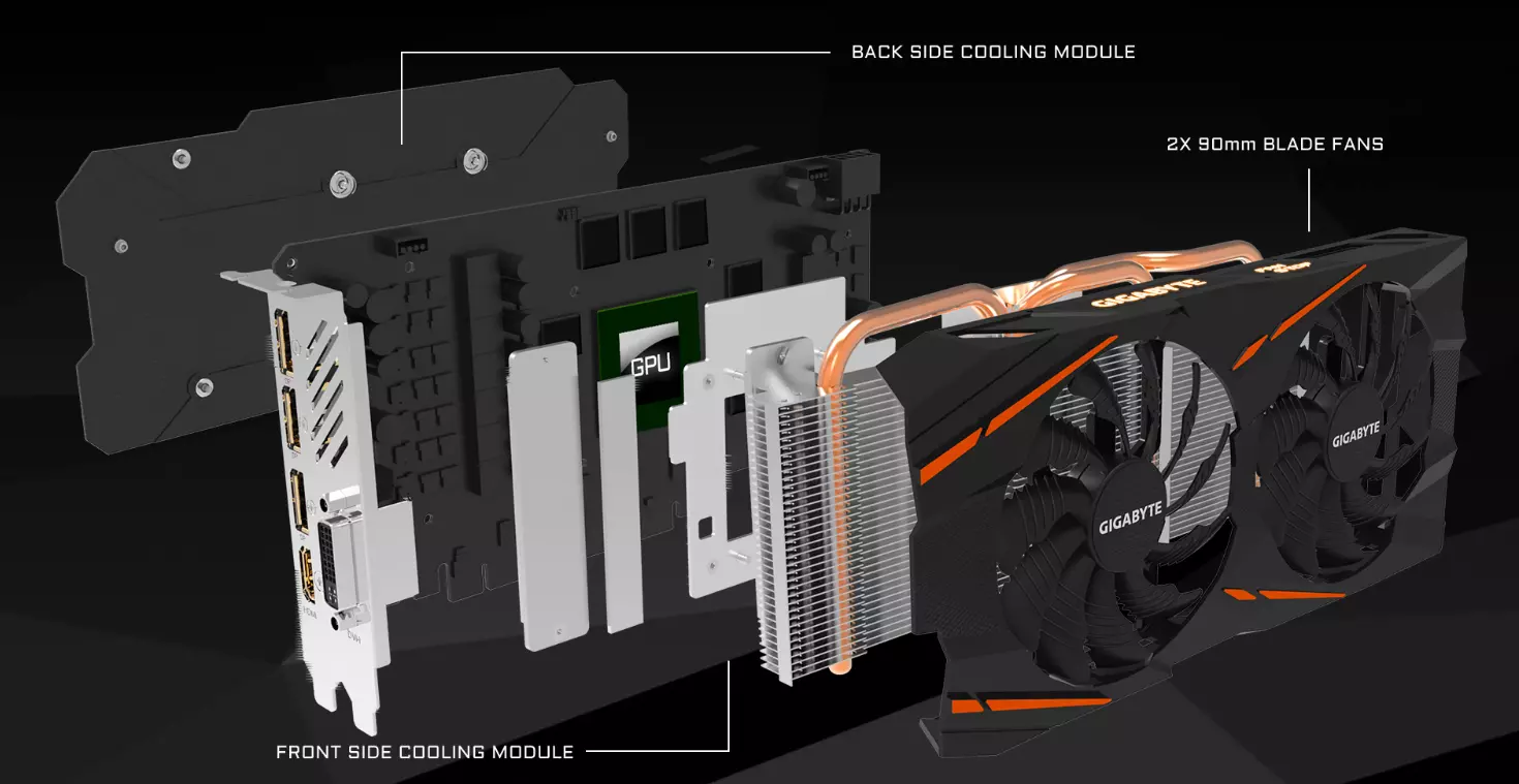 A melegedő komponensek hűtéséről egy WindForce 2X típusú megoldás gondoskodik, ami két darab 90 milliméteres átmérőjű ventilátorral dolgozik, a GPU által termelt hőt hőcsövek juttatják el az alumínium lamellákból álló hűtőtömbhöz. A 232 milliméter hosszú, 116 milliméter széles és 40 milliméter magas videokártya mindössze két slotnyi helyet foglal az adott számítógépházon belül. Videó kimenetei között egy Dual-Link DVI-D, egy HDMI, valamint három darab DisplayPort csatlakozó sorakozik. Stabil tápellátásáról egy darab nyolctűs PCI Express tápkábellel gondoskodhatunk.