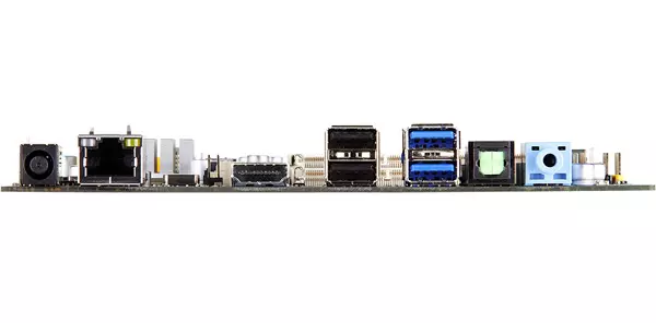 Az alaplap ugyan rendelkezik nyolccsatornás HD audió vezérlővel, de a formátum követelményei miatt analóg Jack audió csatlakozók elhelyezésére nem volt mód – csak egy 3,5 mm-es Jack audió vonalbemenetet találunk a deszkán, valamint egy optikai audió kimenetet. A termék kétcsatornás előlapi HDA kivezetést azért tartalmaz. A Gigabyte újdonsága két hátlapi USB 3.0-s és két USB 2.0-s portot kínál, valamint kivezetés formájában további két USB 2.0-s port is rendelkezésre áll. A sort egy Gigabites Ethernet port, valamint egy HDMI 1.4-es videó kimenet zárja.