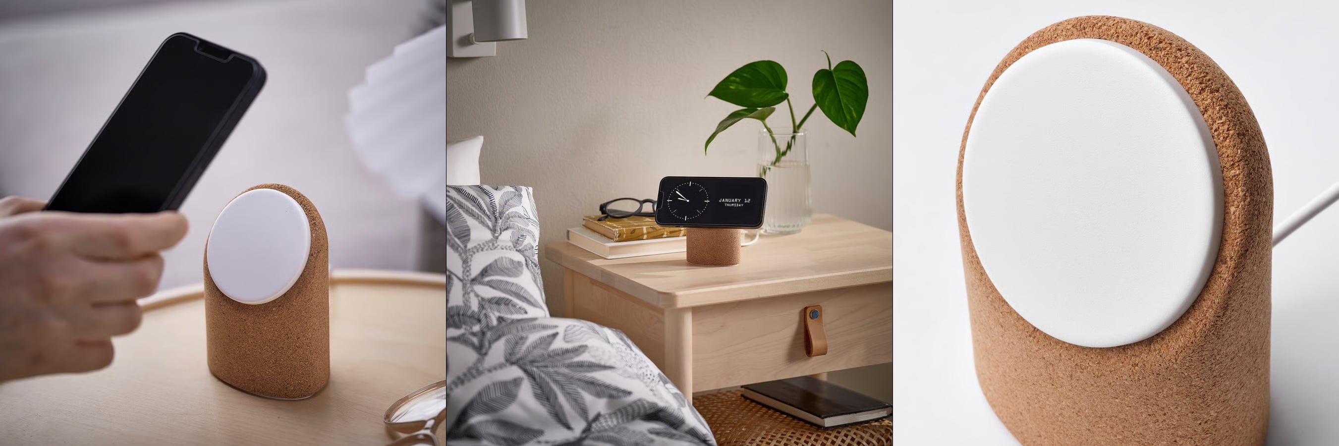 A harmadik eszköz a Västmärke vezeték nélküli töltő állvány, ez már a döntve, egy emelvényen tartja a rábízott okostelefonokat. Az állványon a mobil lehet fekvő vagy álló orientációban, beállítható az éjjeli szekrényen órának a folyamatosan aktív képernyős móddal, és ezzel párhuzamosan reggelre feltöltődik energiával. A burkolat jelentős része parafából készült, így környezetbarát, csak az a része a műanyag, amire a mobiltelefon felfekszik.
