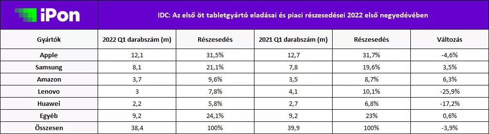 2021 elején az egy évvel korábbihoz képest 55 százalékkal adtak el több táblagépet, ami egészen döbbenetes szám. Szinte az összes gyártó elképesztő teljesítményt nyújtott, vittek az emberek mindent, amit csak értek. Viszont most már csak tartotta magát a piac, illetve némi visszaesés is történt. Egészen pontosan 3,9 százalékos forgalomcsökkenésről számolhatunk be most, az egy évvel korábbi 39,9 milliós eladási darabszámot most egy 38,4 milliós adat követte.