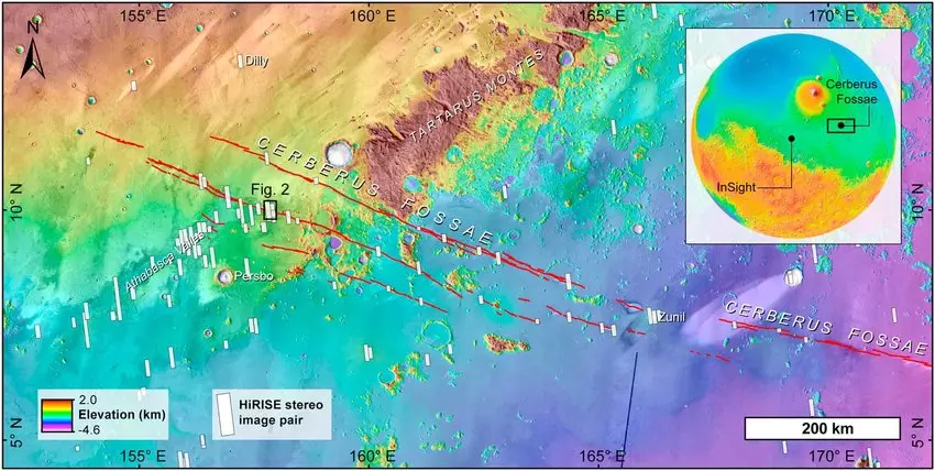 A Nature Astronomy oldalain nemrég megjelent tanulmányban a szakértők a Mars ezen régiójára összpontosítottak. A bolygó felszínének nagy részén olyan jellegzetes földtani képződmények, például olyan gerinccsoportok figyelhetők meg, amelyek akkor keletkeznek, amikor a bolygó kérge lehűlés közben összehúzódott. Az Elysium Planitia azonban egy kiemelkedés a felszínen: bizonyíték a kéreg megnyúlására, ahogy a helyi terület tágult, miközben a környező részek összehúzódtak. A Cerberus Fossaet alkotó repedések olyan hasadékok, amelyeknél a kéreg e tágulás miatt széthasadt. A szakértők azt is megmutatták, hogy a sok millió évvel ezelőtt keletkezett becsapódási kráterek aljának dőlésszöge pedig arra utal, hogy ez a kiemelkedés viszonylag fiatal keletkezésű.