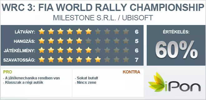 Szerettem volna egy külön bekezdést nyitni a játék audiotartalmának, de nem láttam értelmét, mert a motorhangok elfogadhatók, zene azonban nem szól. Ez is egy olyan apróság, amit simán ki lehetett volna küszöbölni. Ha valaki reális hangélményt szeretne, maximum kilövi a zenét és kész. De nem, a WRC 3-at készítő Milestone jobbnak látta levenni a muzsikát a palettáról. Ez a döntés pedig jól prezentálj a játék fejlesztése mögött meghúzódó szellemet... ami nincs. Ebben a programban nem érezni, hogy alkotói szerették, hogy törődtek vele, hogy igyekeztek megkedveltetni az emberekkel. Süt róla a termékközpontú megközelítés, melynek hála a dizájndokumentumot is minden bizonnyal valami marketingszakember írta. Akkor tudjuk csak ajánlani, ha valaki nagyon szereti a ralit, és bár nem rossz játék, a sorozat ezen felvonása sehogy sem léphet ki a középszerből.