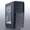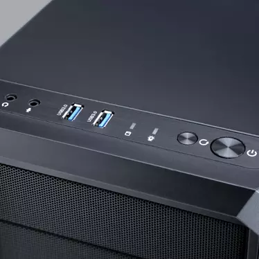 Az előlapi portok ezúttal a ház tetején lapulnak. A csatlakozók között két USB 3.0-s portot, valamint egy 3,5 mm-es mikrofon bemenetet és egy 3,5 mm-es jack audió kimenetet találunk. A lehető legjobb szellőzésről több ventilátorral is gondoskodhatunk, ám alap esetben csak egy 120 milliméteres átmérőjű, 1200-as percenkénti fordulatszámon üzemelő, halk Xigmatek légkeverőt kapunk, ami narancssárga lapátokkal érkezik és a ház hátulján foglal helyet.