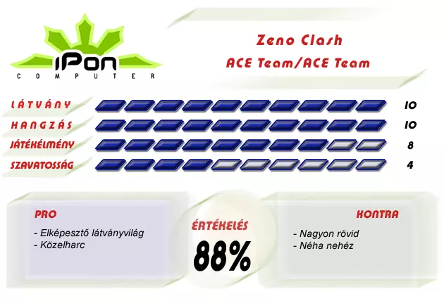 Elmondható, hogy a Zeno Clash egy zseniális játék lett. Sőt, talán ez egyszer már inkább alkotásnak nevezném, mert ha játék közel kerülhet a művészethez, akkor itt ezzel a ritka esettel állunk szemben. Annyira egyedi, jó, és hatásos, hogy a végigjátszása után biztosan a hatása alatt tart még néhány óráig. Minden apróbb hiányossága, és bántó rövidsége ellenére is kötelező vételnek tartom a Zeno Clasht. Nem csak FPS rajongóknak, de mindenkinek, aki elég érett a témára. Azért egy 18+-os karika elkél a virtuális dobozra a sok furcsa, torz figura miatt. A demót minden kételkedő azonnal töltse le!