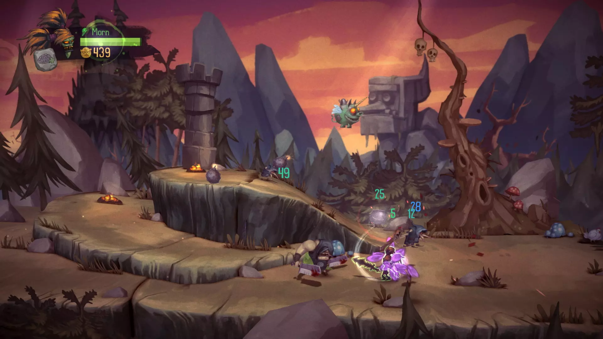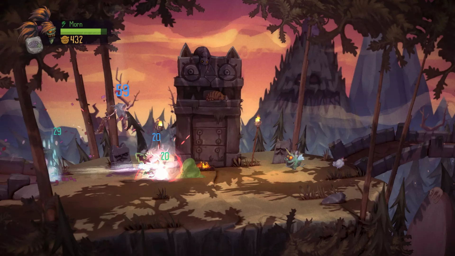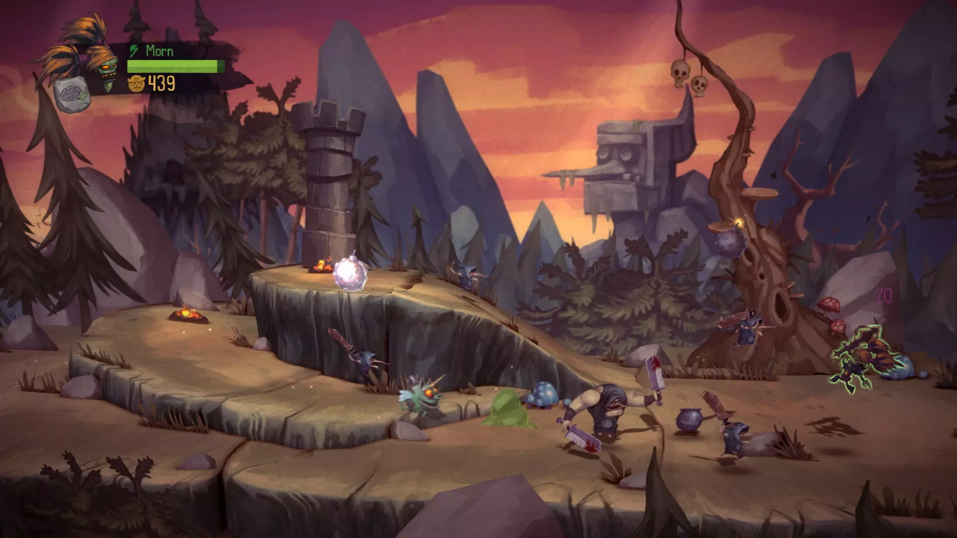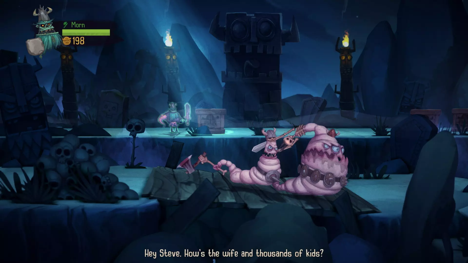 Képességeink sokrétűek, egészen pontosan tudunk ugrani, kicsit/nagyot csapni, különleges képességet használni és tárgyakkal dobálózni, de még védekezni is. Ez bőségesen elegendő egy marcona viking harcosnak. A ládákból HP töltő agy darabokat és pénzt gyűjthetünk, úgyhogy ha jót akarunk, mindent szét kell csapkodni, ami csak szembejön a pályákon. A pálya végén úgyis a leosztott sebzés és az összeharácsolt arany tekintetében kapunk pontszámot. És remek zenéket is! Emellett pedig ahogy haladunk a történetben, újabb fegyvereket, rúnákat nyithatunk ki, valamint a térképen nem csak a fő szálat követhetjük, hanem mellékküldetéseket is találunk. Ez nagyjából 30 pályát jelent, valamint ott van még a lehetőség a versus pályákon egymás püffölésére is.