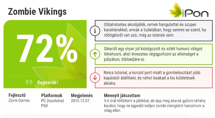 Az összkép pedig? Magányos kalandozáshoz is remek, de mivel akár 4-en is zúzhatunk benne, így máris megnő az újra végigpörgetésének az esélye. Nem egy nehéz játék, de önmagában is megállja a helyét és egyéb jó tulajdonságai is vannak. Amellett, hogy lépten-nyomon belefutunk valami viccesbe, a külalakra se lehet panasz, valamint játéktechnikailag is nagyszerűen egyszerű (és fordítva). Könnyed szórakozáshoz, kikapcsolódáshoz és nagy nevetésekhez remek társ lesz a Zombie Vikings.