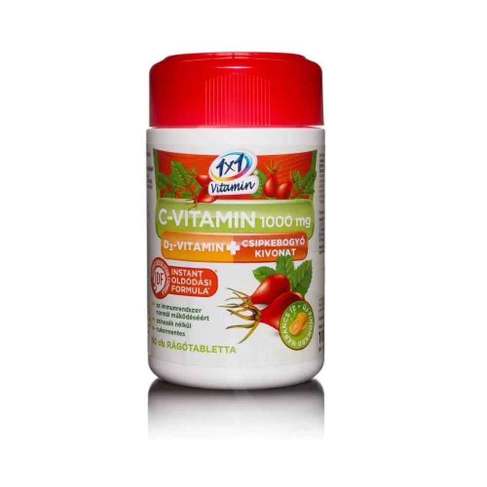 Étrend-kiegészítő rágótabletta narancs ízben. A készítmény 1000 mg C-vitamint, 25 mg csipkebogyó kivonatot és 12,5µg (500 NE) D3-vitamint tartalmaz. A C- és D3- vitaminok hozzájárulnak az immunrendszer normál működéséhez.