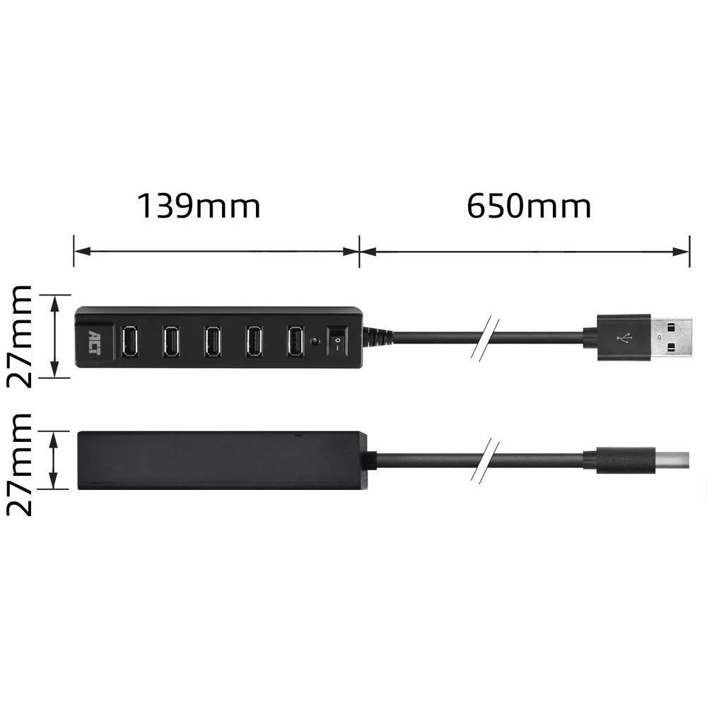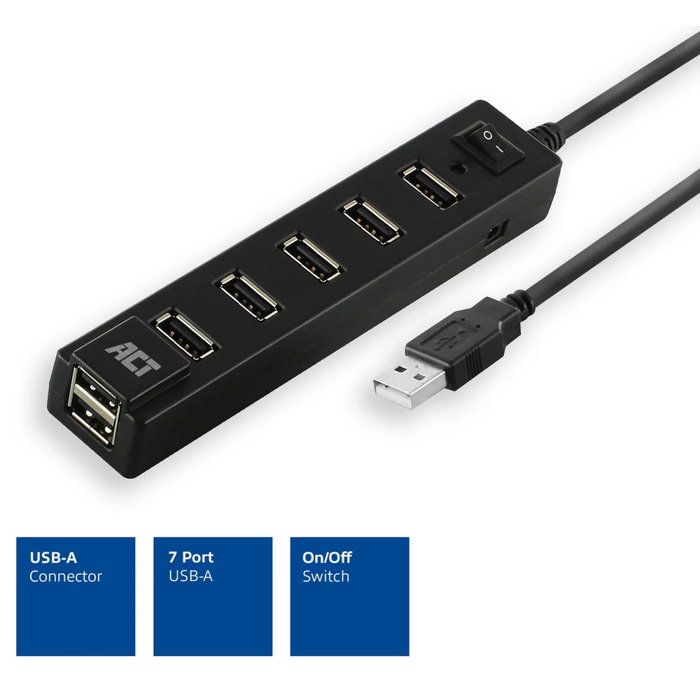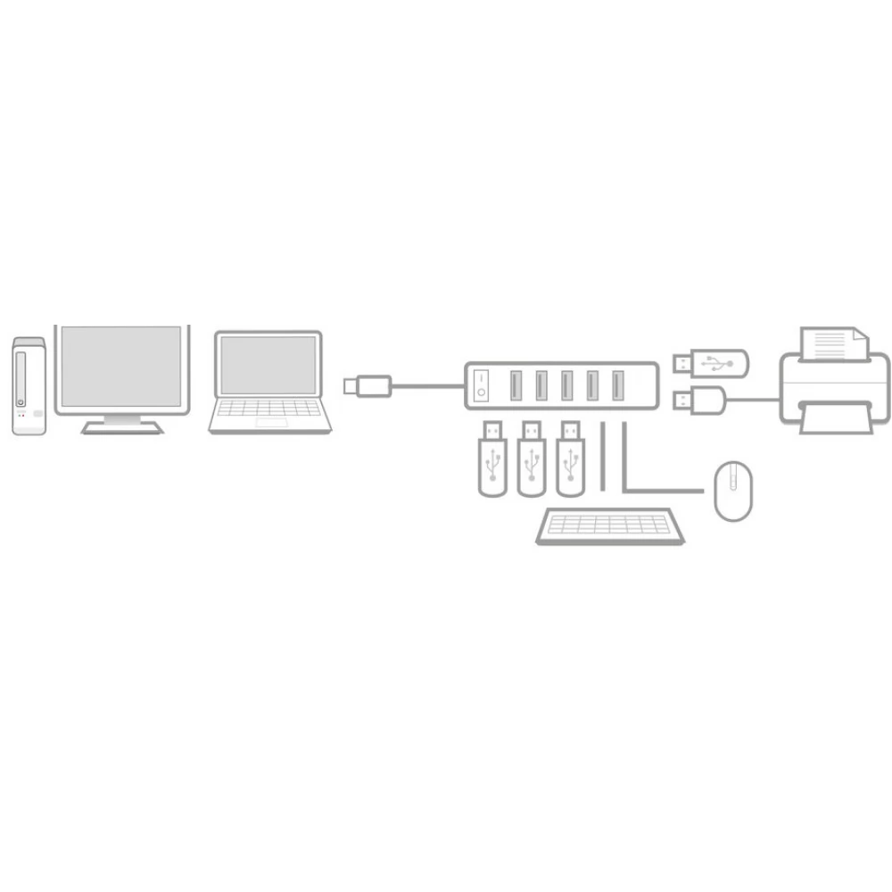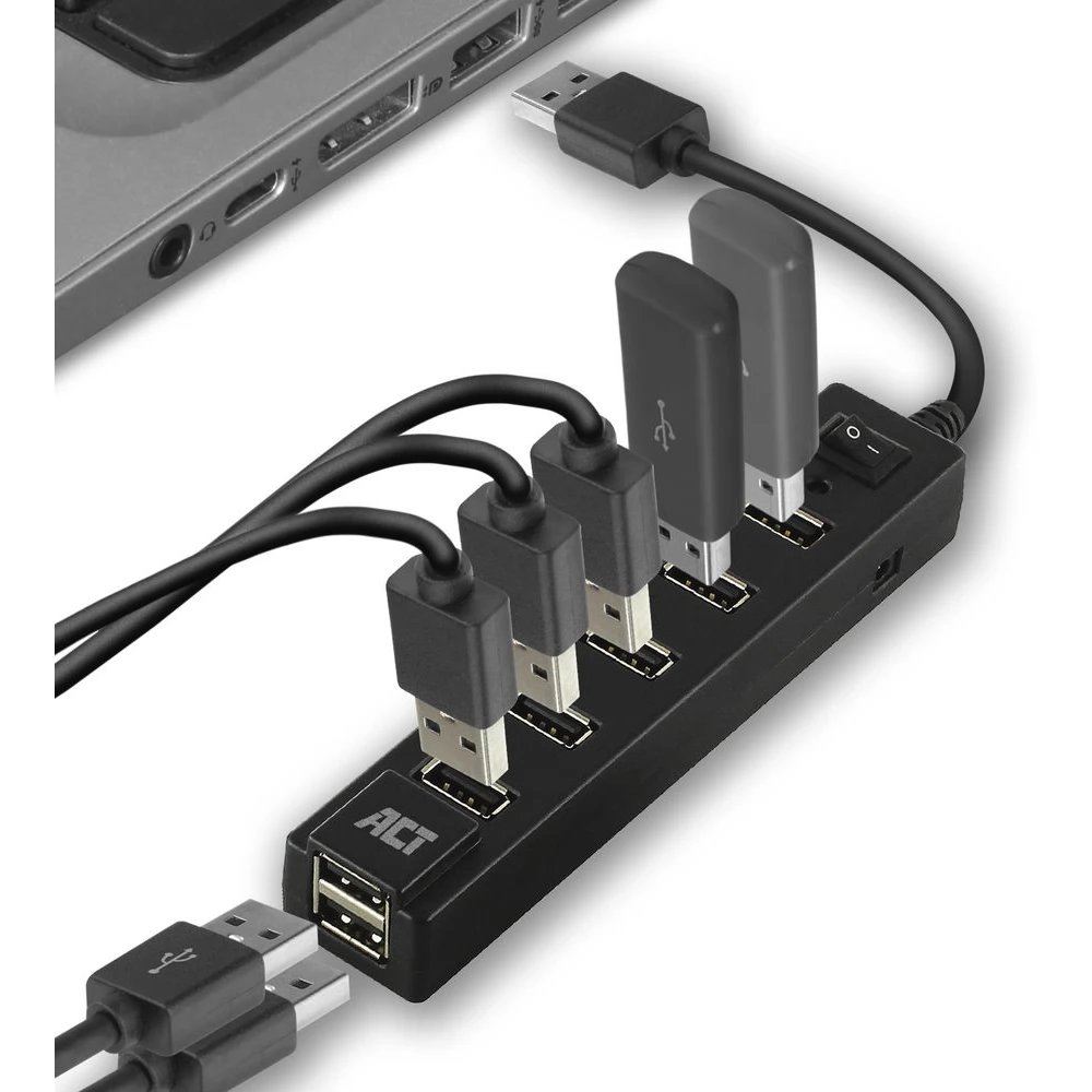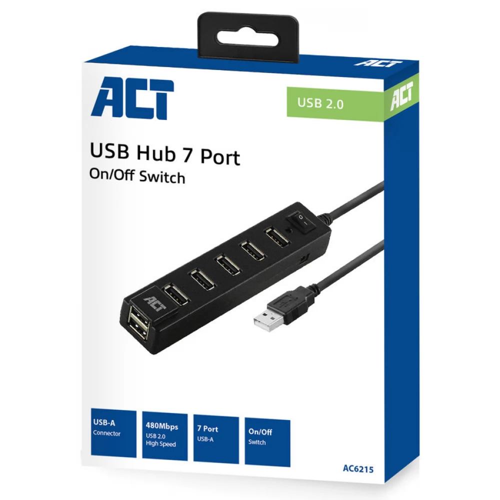 Csatlakoztasson 7 USB-A eszközt laptopjához az AC6215 7 portos USB hub segítségével. A hub ON/OFF kapcsolóval rendelkezik, amellyel egyszerre engedélyezheti és tilthatja le az összes csatlakoztatott eszközt.