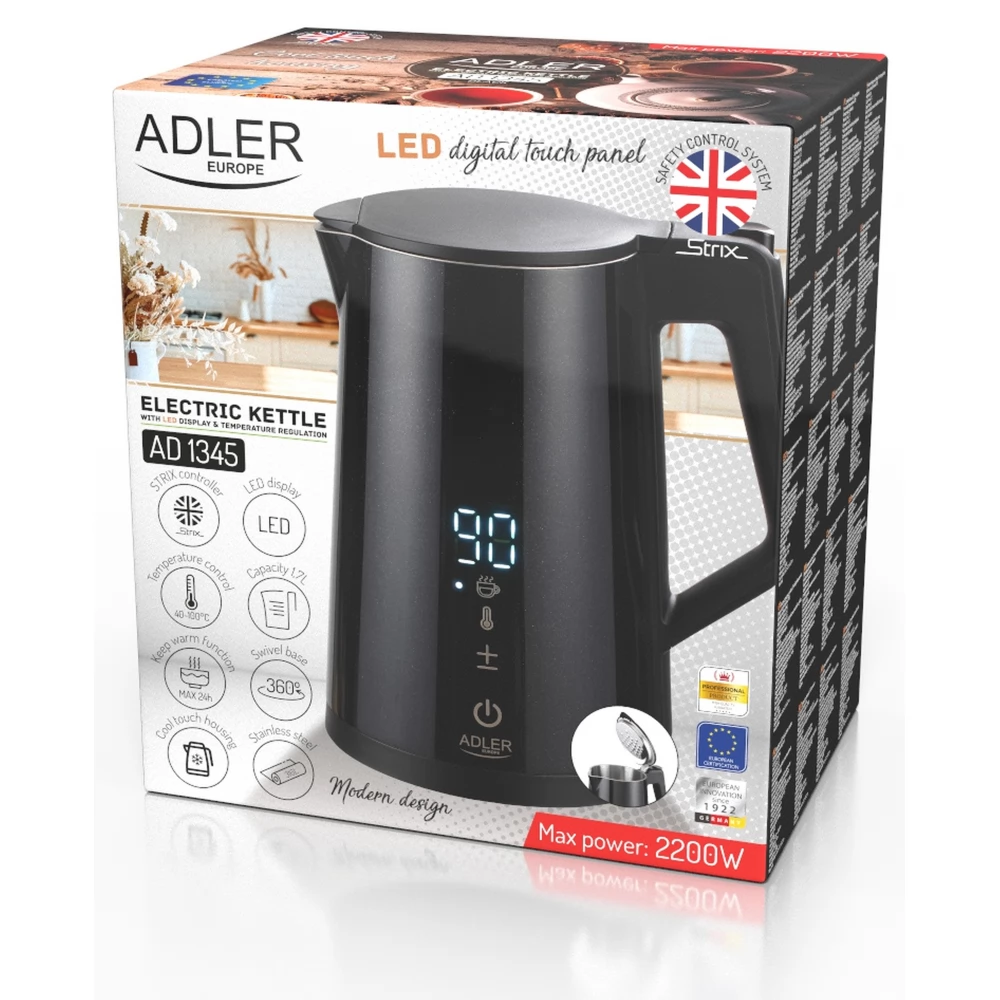 ADLER AD 1345b Vízforraló 2200 W 1.7 L 360°-os forgatható talp rozsdamentes acél / fekete
