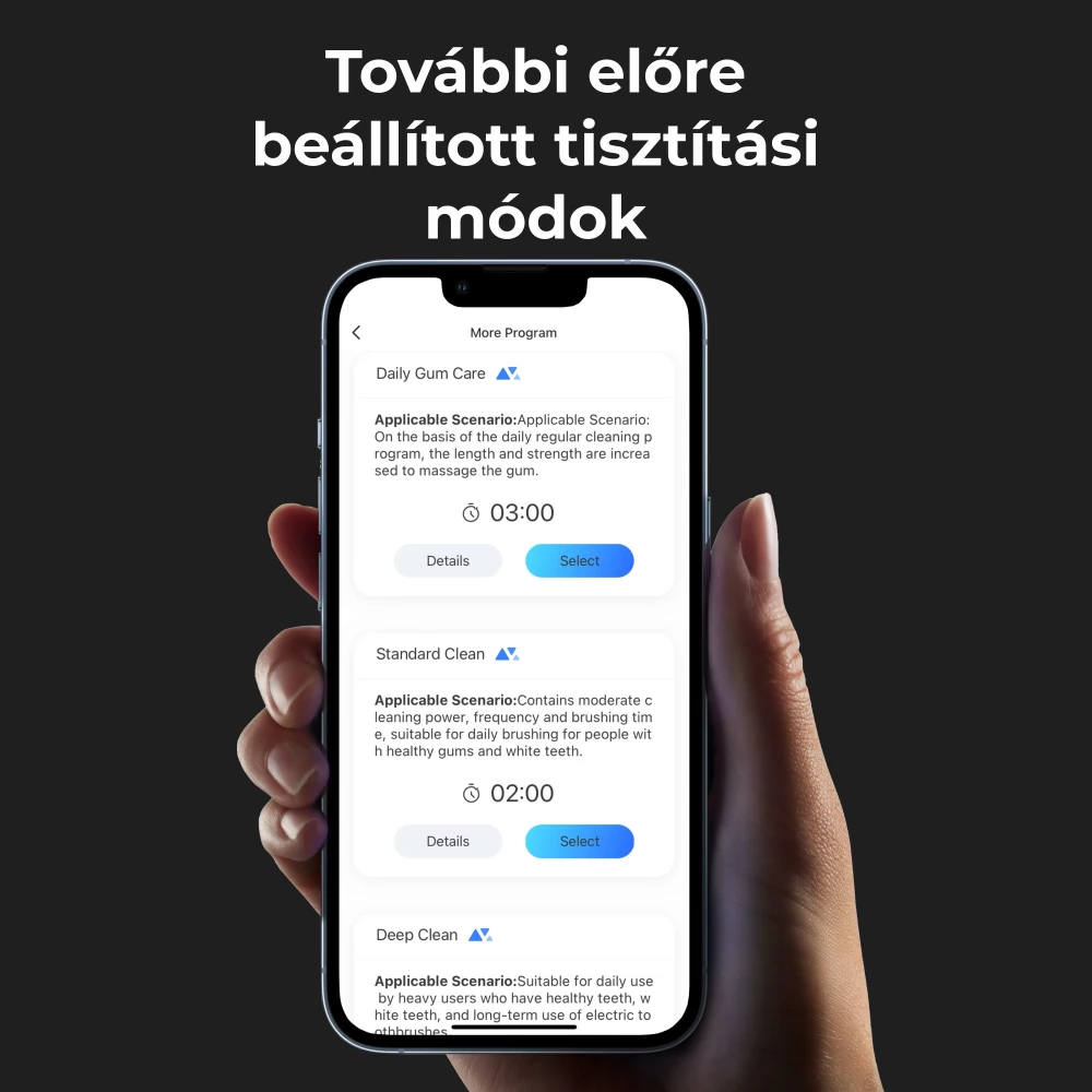 - Fogkefe mód: Lágy 2 perc (430 mp) Tiszta 2 perc (430 mp) Masszázs 2 perc (430 mp) Fehér 2 perc (430 mp) Intelligens 2 perc (430 mp) Fogínyápolás -3 perc (630 mp) Expressz tisztítás 1 perc (415 mp) Mélytisztítás 2 perc (430 mp) Fogszabályzó 3 perc (630 mp) Mélyfehérítés -2,5 perc (530 mp) )