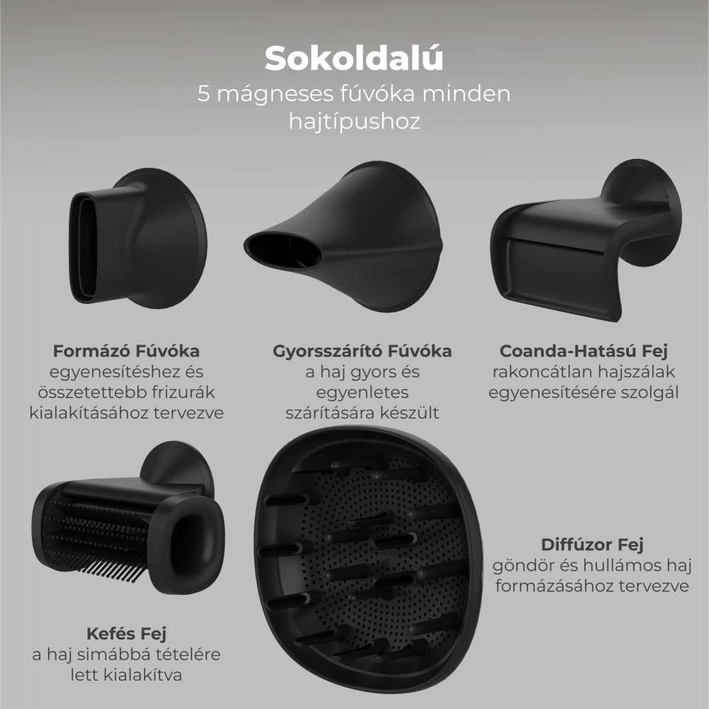 Emelje a hajformázás élményét az AENO HD5 360°-os mágneses fúvókáival. A gyorsan cserélhető sokoldalúságot biztosító mágneses fúvókák lehetővé teszik, hogy könnyedén váltson a tartozékok között, változatos formázási lehetőségeket biztosítva Önnek, és szabadságot az egyedi stílus kifejezésére
