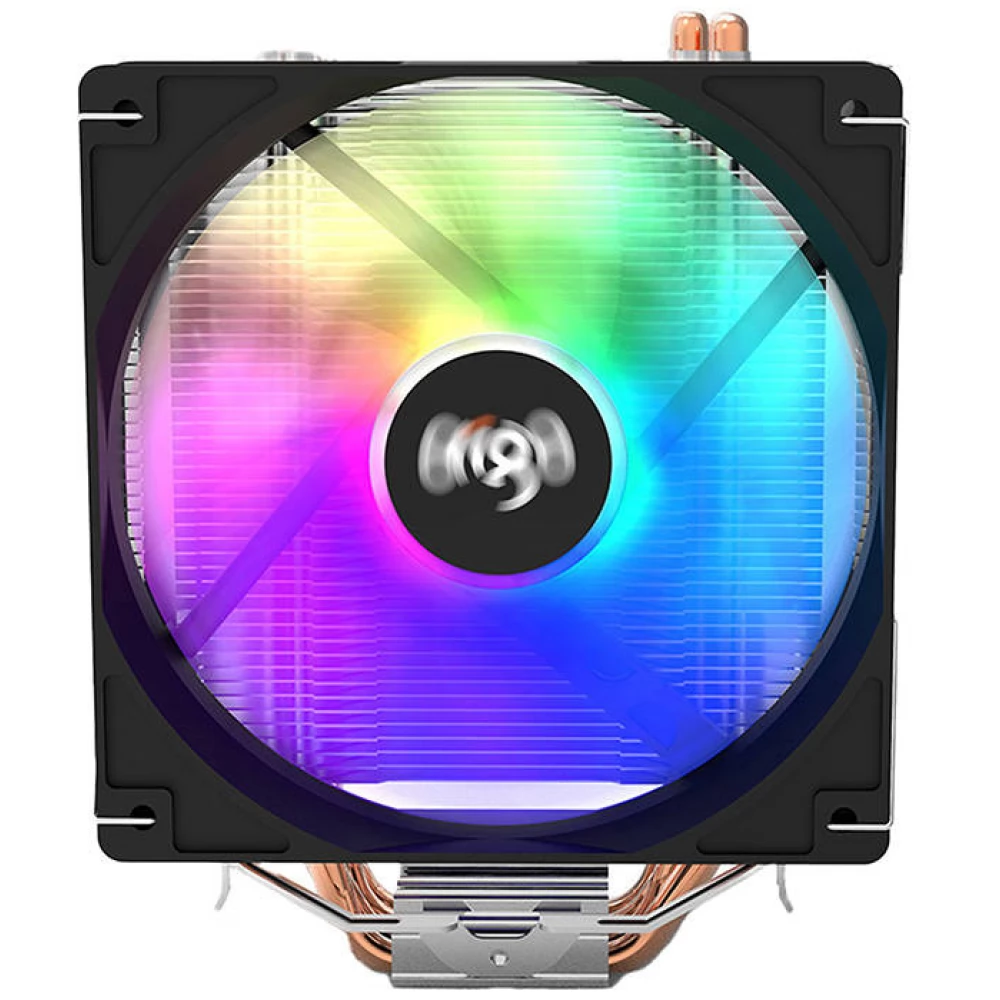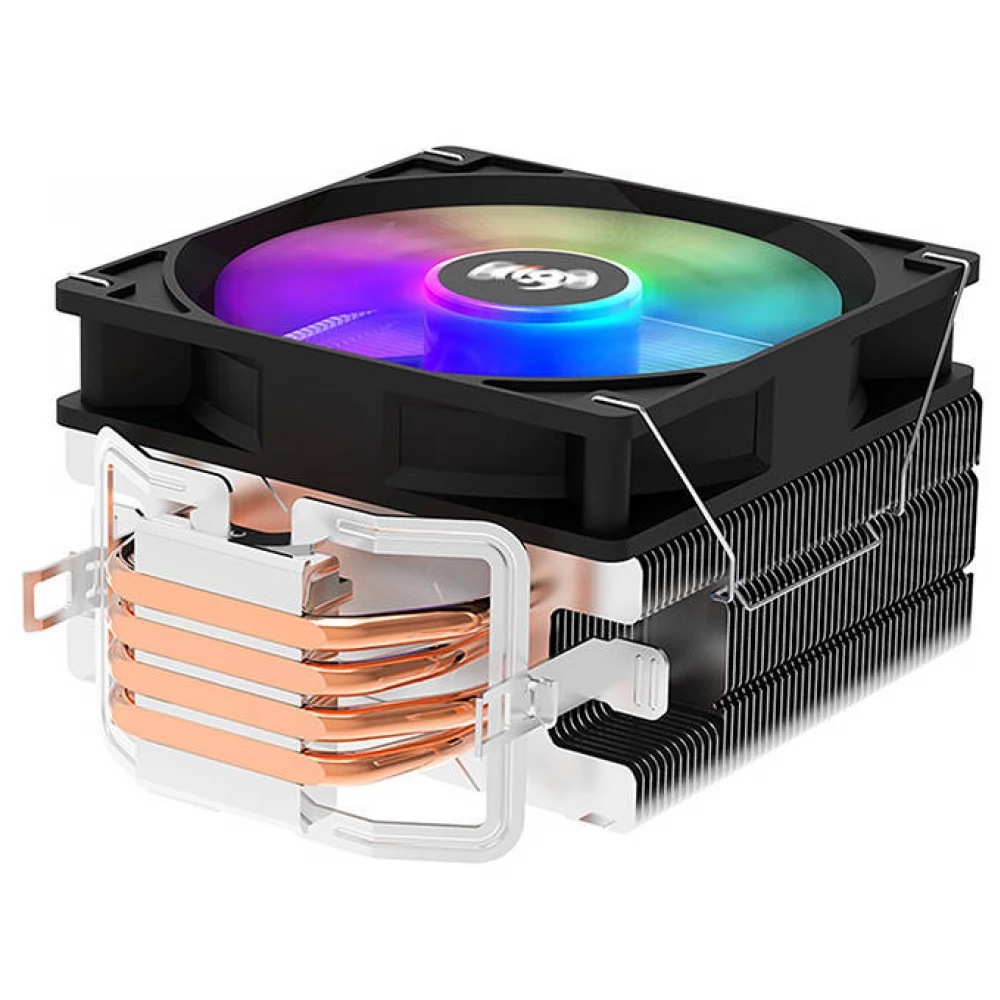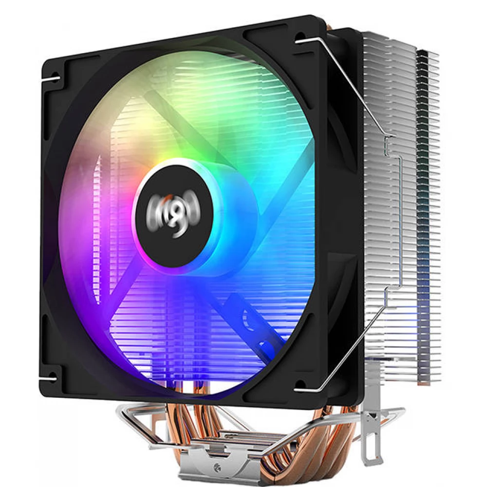 Hővezető csöves univerzális CPU hűtő 120mm-es RGB világítású (nem vezérelhető) ventilátorral és 4 tűs alaplapi PWM csatlakozóval.