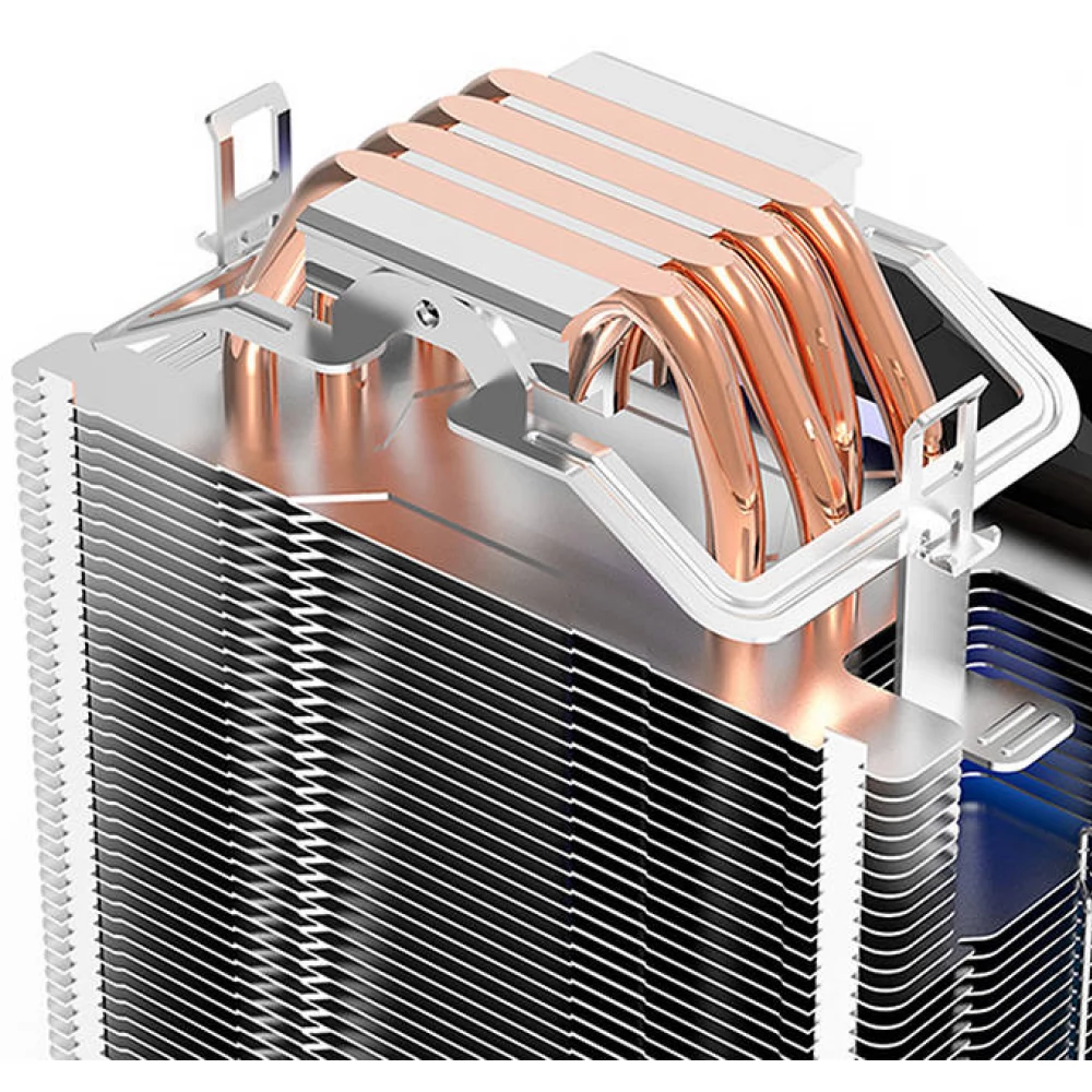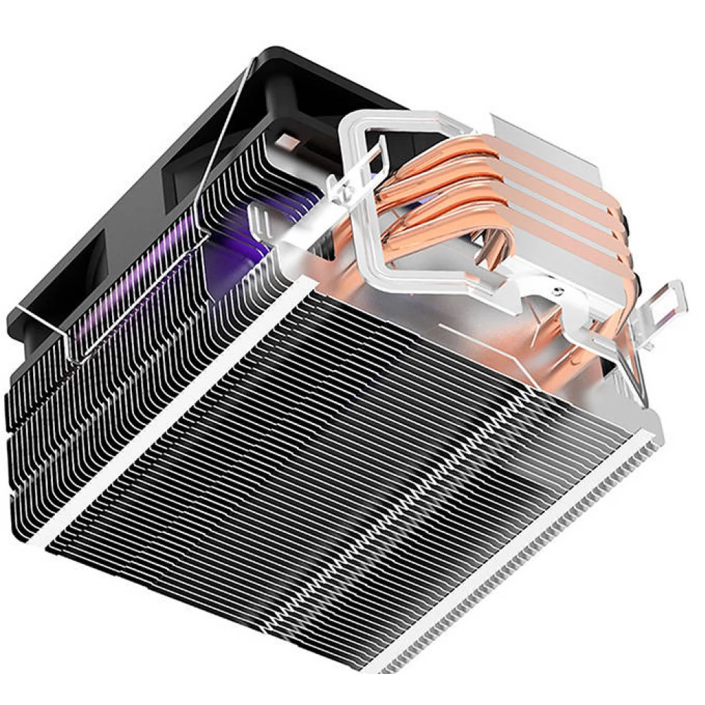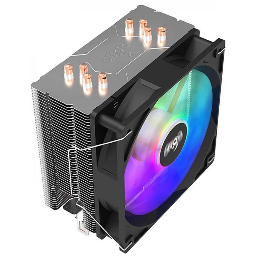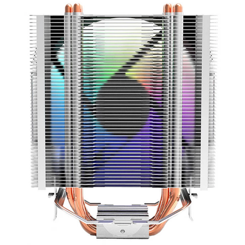 Hővezető csöves univerzális CPU hűtő 120mm-es RGB világítású (nem vezérelhető) ventilátorral és 4 tűs alaplapi PWM csatlakozóval.