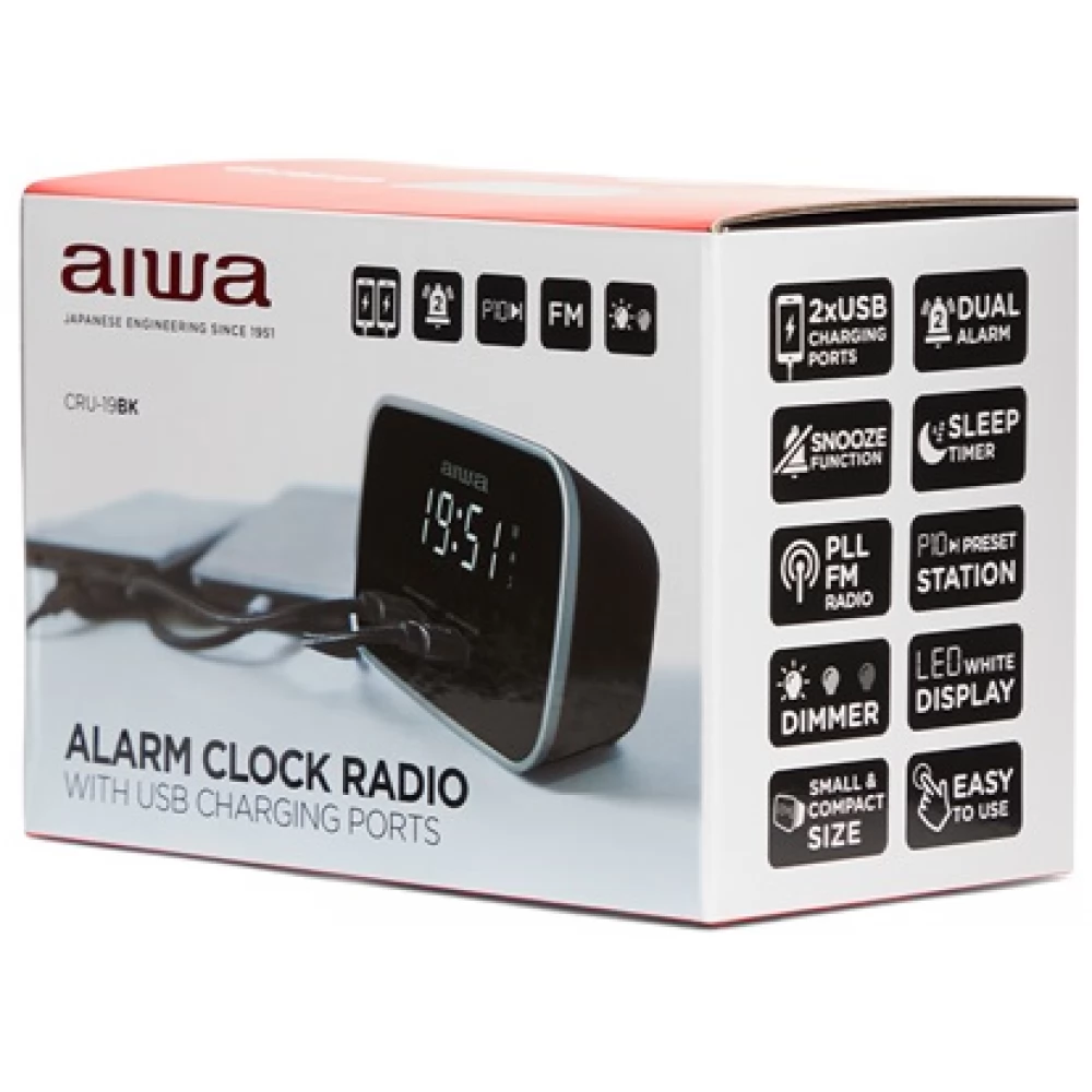 Aki ismeri az AIWA céget, az pontosan tudja, hogy milyen termékekkel örvendeztette meg a vásárlóit. Lenyűgöző, és modern dizájn jellemzi az AIWA CRU-19BK ébresztőórás rádióját. De ez nem csak egy rádió, hanem sokkal több annál. Rendelkezik ébresztő funkcióval, azt be tudjuk állítani, hogy akár a kedvenc rádióadónkat állítjuk be ébresztésként, vagy pedig egy hangjelzést, így mindenki saját igényeire tudja azt szabni. Különlegessége, hogy az előlapon helyet kapott 2 USB csatlakozó is, így akár a telefonunkat vagy tabletünket is tudjuk róla tölteni. Puha tapintású külső borítást kapott a készülék, mely még egyedibbé teszi. PLL (Phase Locked Loop / Fázis Zárt Hurok) rendszerű FM rádió van a készülékben, mellyel tökéletes lesz minden rádióvétel, legyünk bárhol is, hiszen ez a rendszer stabil frekvenciát biztosít, nem befolyásolja a hideg, vagy akár a meleg levegő sem. Az AIWA CRU-19BK minden reggeli ébredésben biztos parterünk lesz.