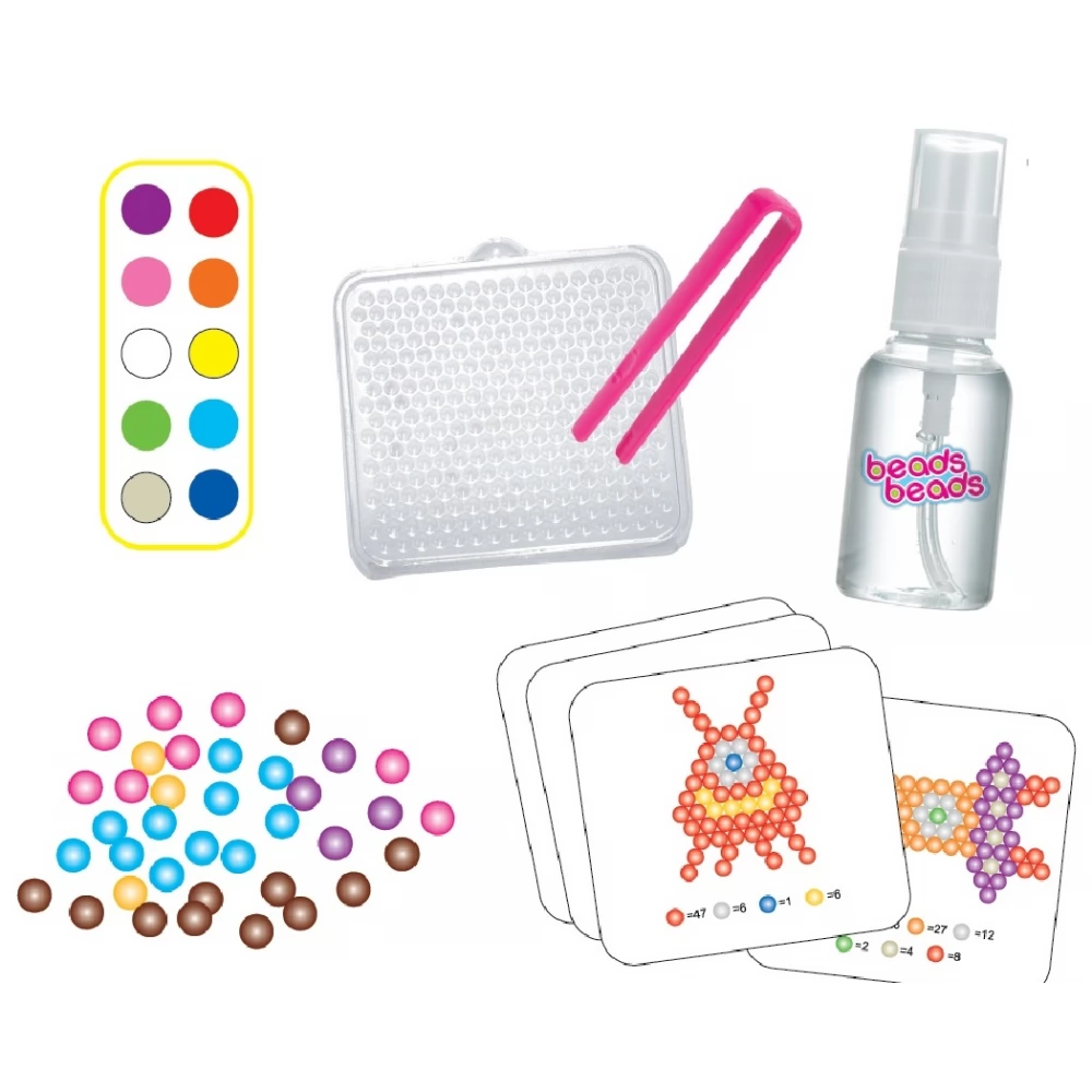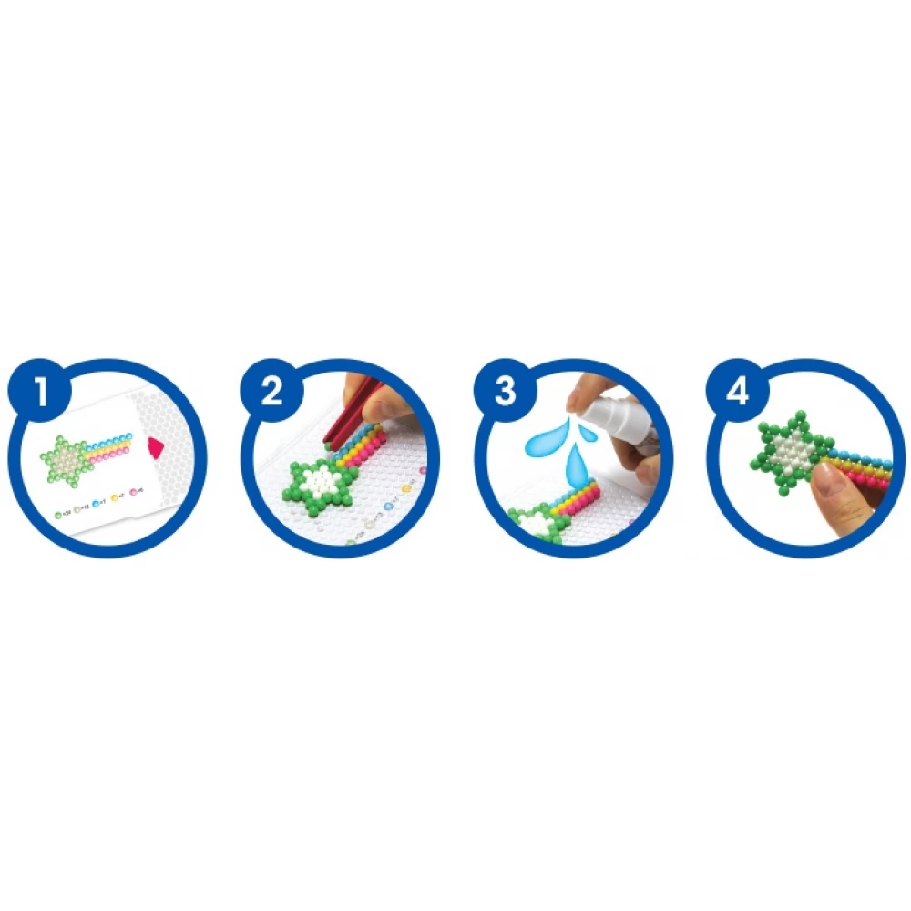 Elkészítés: Tedd fel a gyöngyöket a lapra, a 4 féle sablon egyikét használva, a csipesz segítségével. Töltsd fel a pumpás üveget vízzel, spricceld le a kirakott gyöngyöket, és száradás után az alkotás eltávolítható az alapról. (nem kell ragasztani)