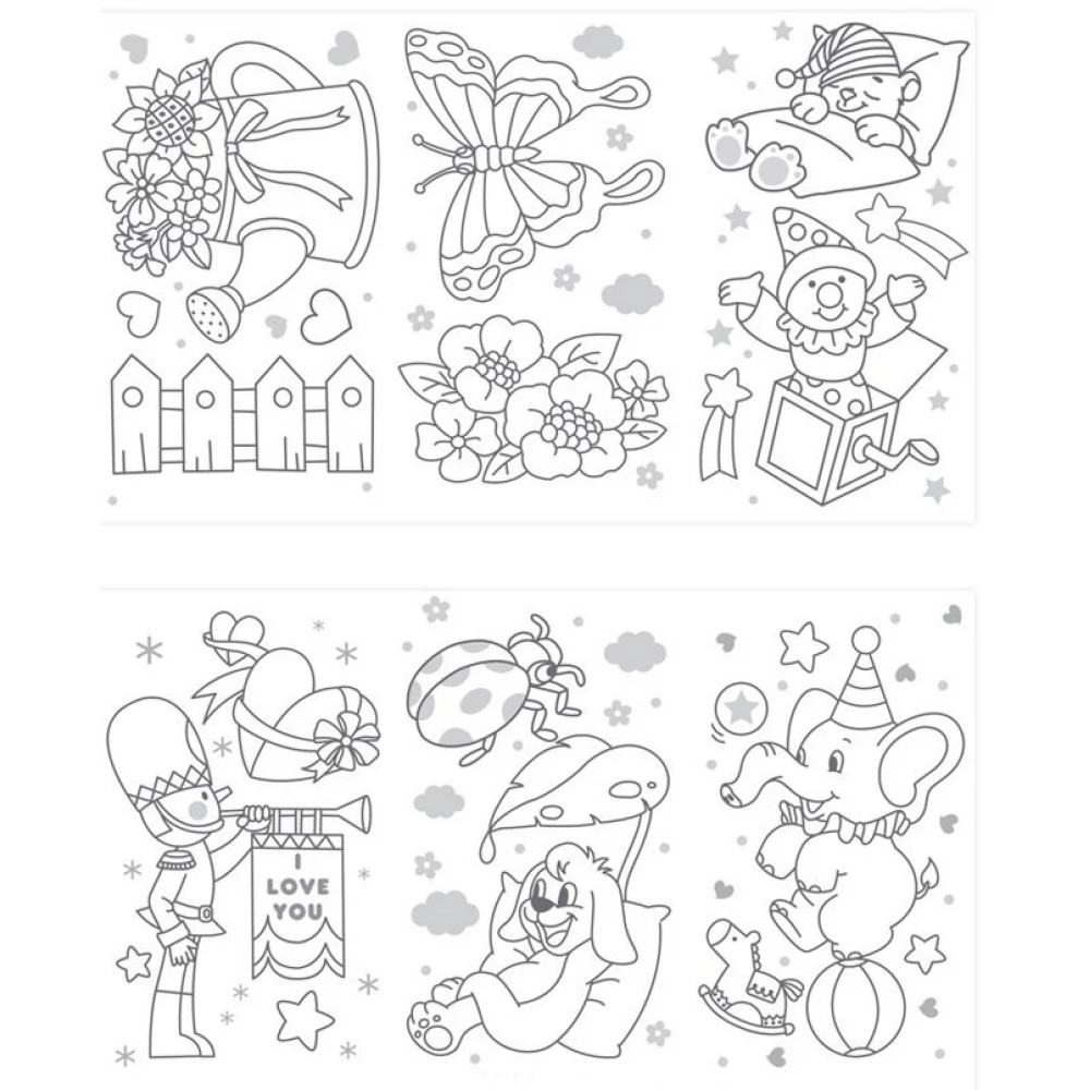 Karácsonyi témájú, nagy üvegfestőkészlet. A készlet 6 darab 22 ml-es üvegfólia festéket és többféle mintát tartalmaz.