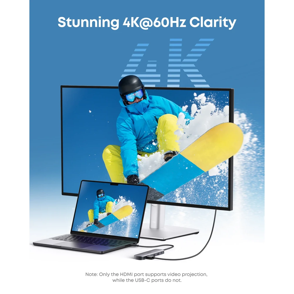 HDMI porttal, két USB-A 3.0 porttal és egy USB-C adatporttal rendelkezik, amelyek mindegyike 5 Gbps átviteli sebességet biztosít. Emellett egy USB-C PD bemeneti porttal is rendelkezik akár 100 W-os töltéshez, valamint kettős SD és TF kártyahellyel, mindezt kompakt kialakításban.