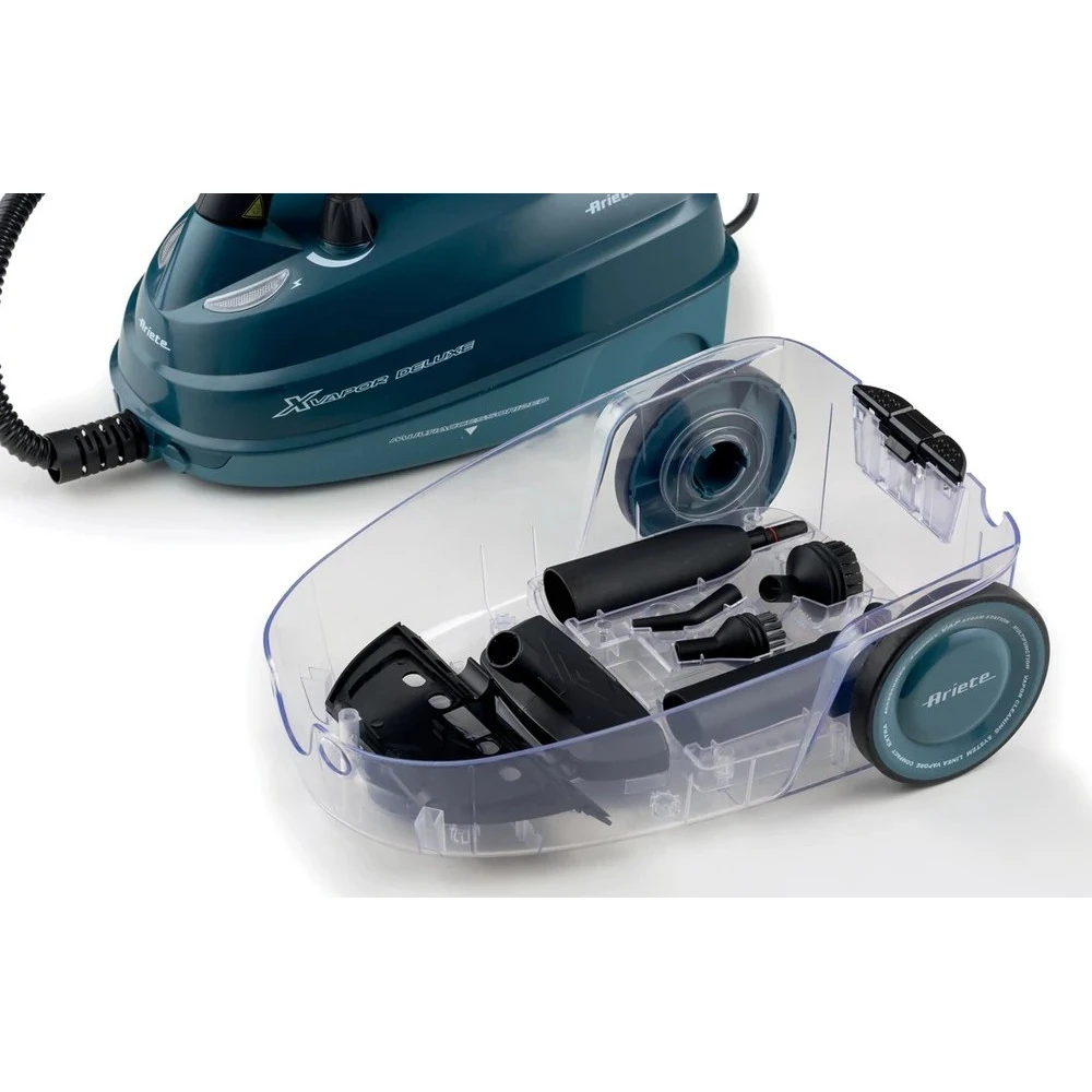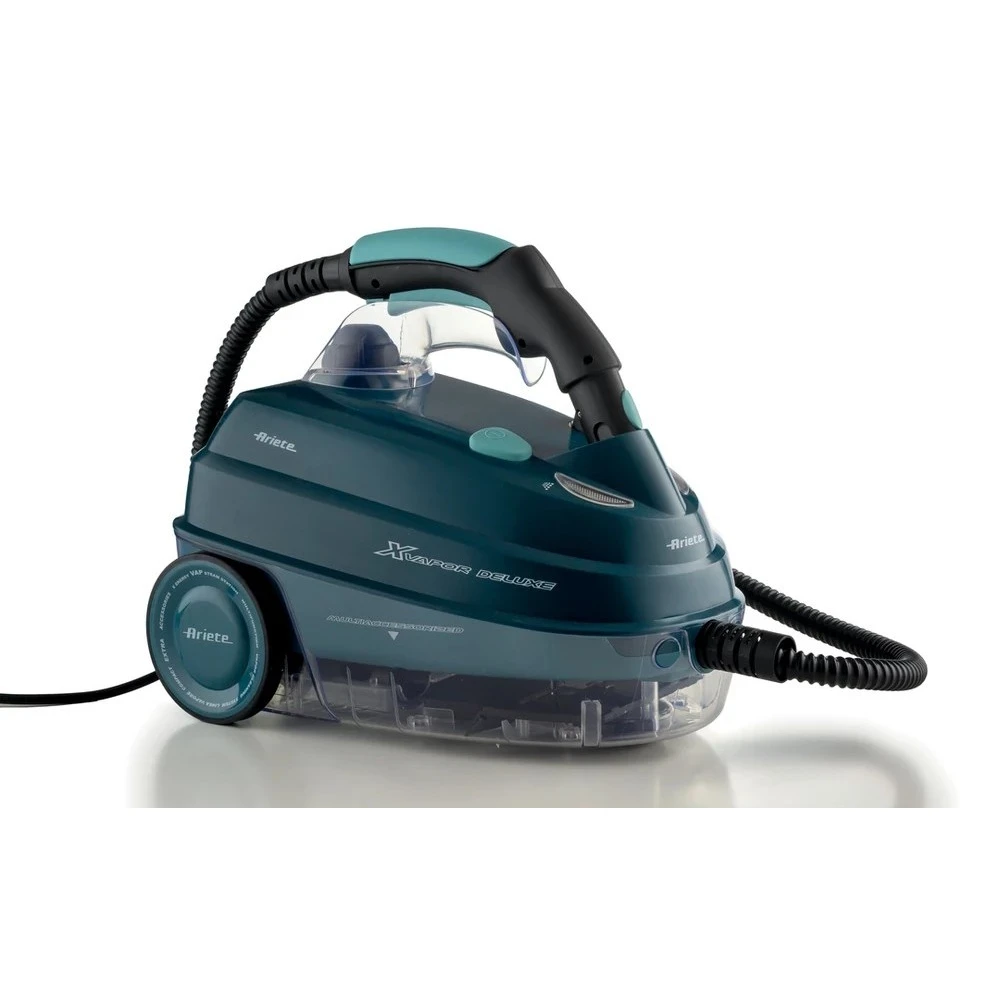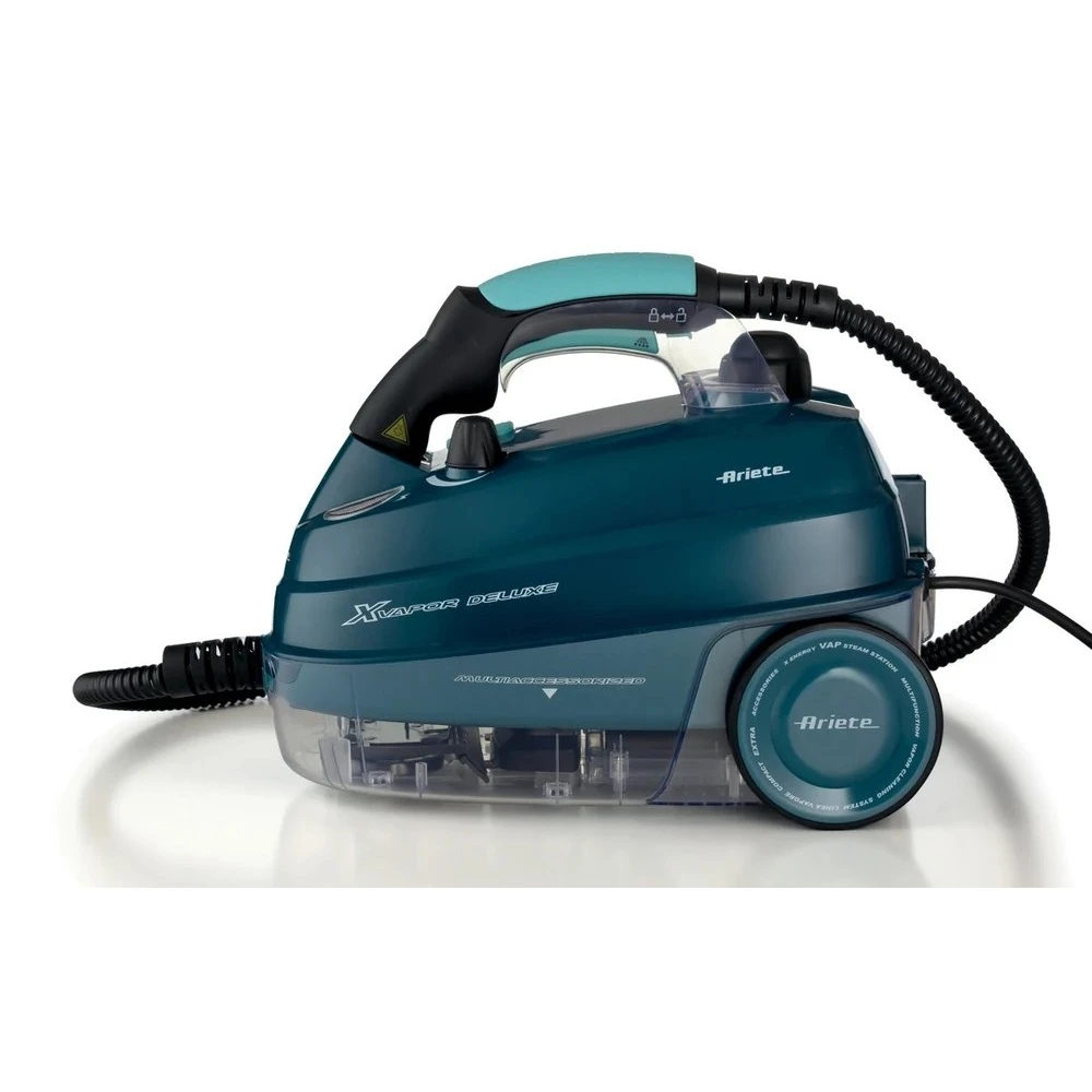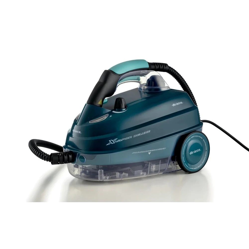Az ARIETE XVapor Deluxe multifunkciós gőztisztító 5 bar gőznyomással és 1500 W teljesítménnyel hatékonyan eltávolítja a szennyeződéseket, zsírt és baktériumokat vegyszer nélkül. A nemesacél bojler kapacitása 1,6 liter, felmelegedési ideje mindössze 7-8 perc. Biztonsági kupak, működésjelző fény, be/kikapcsoló gomb és „gőz kész" visszajelző tartozik hozzá.\n\nA készülék 2 méteres gőzcsővel és 6 méteres tápkábellel rendelkezik, így kényelmesen mozgatható. Az első kerék 360 fokban fordul, megkönnyítve a manőverezést. A tartozéktartó a készülék aljában kapott helyet.\n\nA csomag teljes körű tartozékkészletet tartalmaz: padlókefe és felmosó kendő, kis kefe ablaktisztító kellékekkel, gőzfecskendező fej, 90 fokos szórófej, körkefék (kicsi és nagy), 2 hosszabbító cső, tölcsér és mércézett feltöltő pohár. Tömege 7,01 kg.