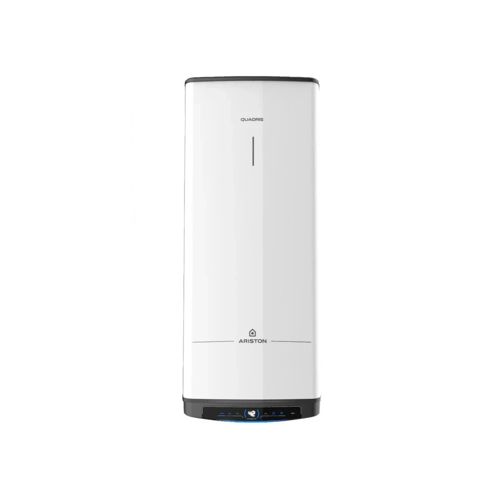 Az Ariston márka legújabb termékcsaládja a szögletes kialakítású Quadris Wifi. Ez az elektromos tárolós vízmelegítő kizárólag függőlegesen telepíthető. A beépített Wi-Fi-nek köszönhetően az okostelefonjára telepített alkalmazáson keresztül otthonától távol is vezérelheti. Használata rendkívül egyszerű, hiszen érintőgombos vezérlőjén azonnal látható a melegvíz hőmérséklete, a Wi-Fi és ECO EVO, valamint a BOOST funkciók státusza. Az ECO EVO funkció kiválasztásával a melegvíz felhasználás, illetve a fogyasztói szokások megtanulásával a készülék működése optimalizálható, így jelentős energiamegtakarítás érhető el. A folyamat 4 hét tanulás után éri el a teljes hatékonyságát. A termék akkor is garantálja a minimális melegvízkészletet, ha nincs vízfogyasztás. A BOOST funkció átmenetileg 80 °C-ra állítja a hőmérsékleti alapértéket. Az Antilegionella funkció egy órán keresztül 60 °C-on tartja a víz hőmérsékletét, ezzel megakadályozva a baktériumok elszaporodását. Az Ariston Quadris Wifi az alkalmazáson keresztül programozási lehetőséget is biztosít: két különböző időpontra két különböző hőmérsékleti alapértéket lehet kiválasztani a hét minden egyes napjára. A vízmelegítő kiszámolja a fűtési sebességet és a fűtés elindítására legalkalmasabb pillanatot annak érdekében, hogy a kívánt időpontban elérje a beállított értéket. A kijelző oldalain található jelzőcsíkok segítségével ellenőrizhető a vízmelegítőben lévő melegvíz szintje egy négyszegmenses skálán. A melegítési szakaszban a jelzőcsíkok fokozatosan kapcsolnak be, így jelzik a termék belsejében lévő melegvíz hőmérsékletének növekedését egészen addig, amíg el nem éri a beállított hőmérsékletet.