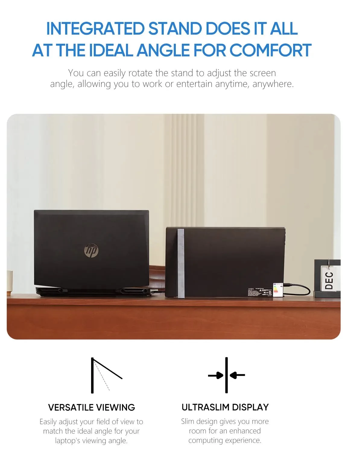 A tükröződésmentes kijelző 16,1 hüvelykes, Full HD (1920 x 1080) felbontású és 16,7 millió színárnyalatot képes megjeleníteni, így a felhasználó a lehető legélesebb képet kapja, legyen szó munkáról, játékról vagy filmnézésről. Az IPS (In-Plane Switching) technológia gondoskodik a pontos és élénk színek valósághű ábrázolásáról. A monitor szükség szerint elfordítható.