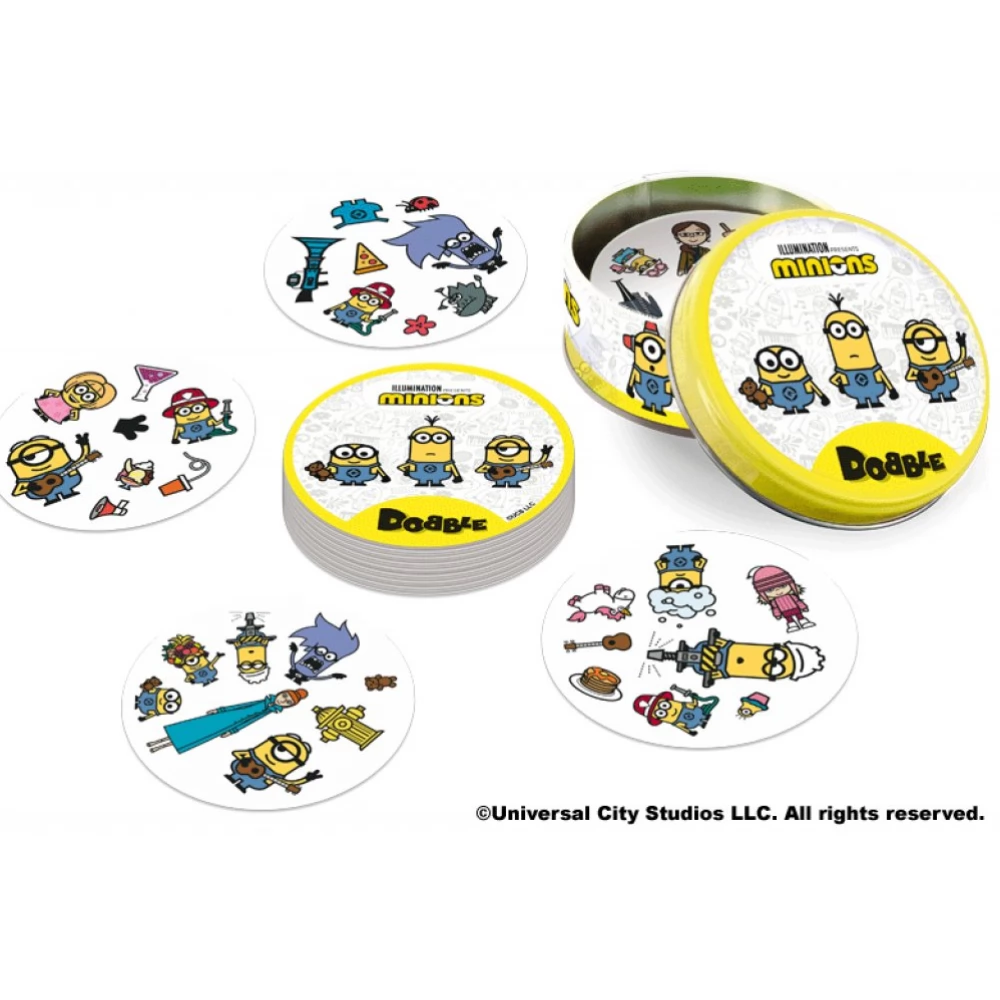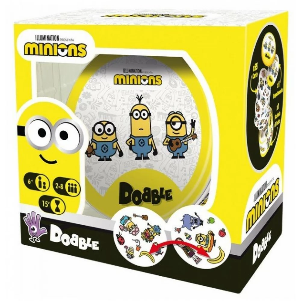 A klasszikus Dobble kártyajáték Minyonos változata 55 kártyával, 8 szimbólummal. A Dobble játékokban a feladat az azonosságok felismerése a kártyák között. A játékszabály 5 különböző játékvariációt biztosít.