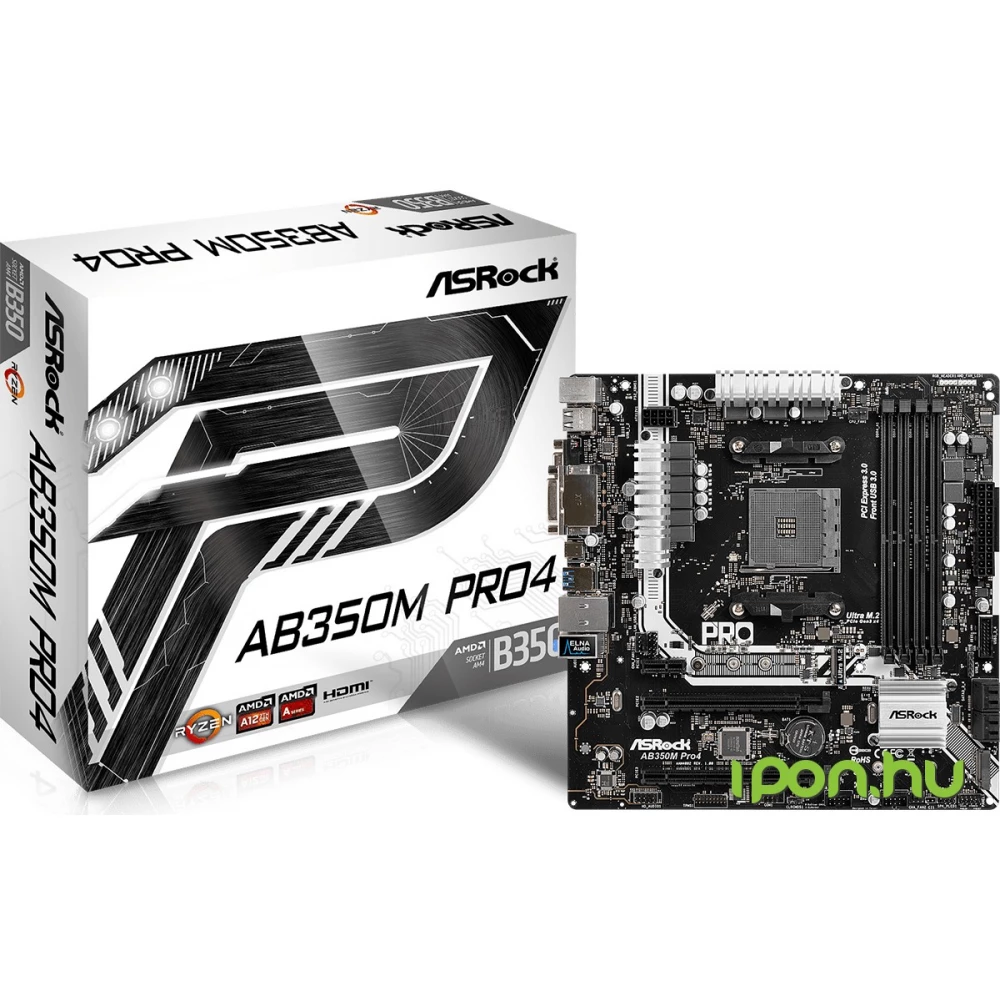 ASROCK AB350M Pro4 típusú alaplap Socket-AM4 foglalattal, AMD B350 chipsettel, Processzorban integrált videókártyával, 4 darab DDR4 memóriafoglalattal (max 64GB). 6 darab USB 2.0 port, 7 darab USB 3.0 port.