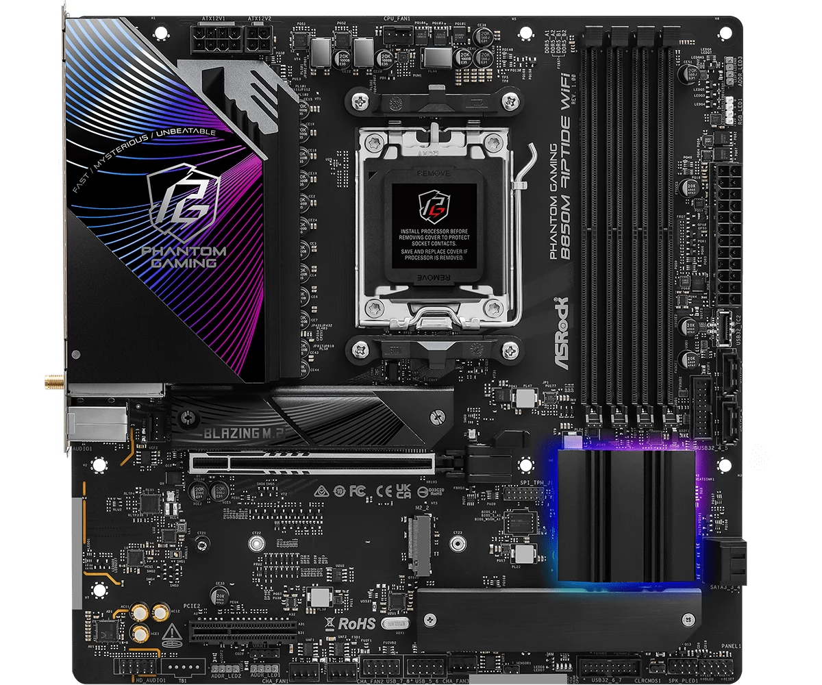 ASROCK B850M Riptide WiFi típusú alaplap Socket-AM5 foglalattal, AMD B850 chipsettel, Processzorban integrált videokártyával, 4 darab DDR5/CUDIMM memóriafoglalattal (max 256GB). 8 darab USB 2.0 port, 7 darab USB 3.0 port, 2 darab USB 3.1 port.