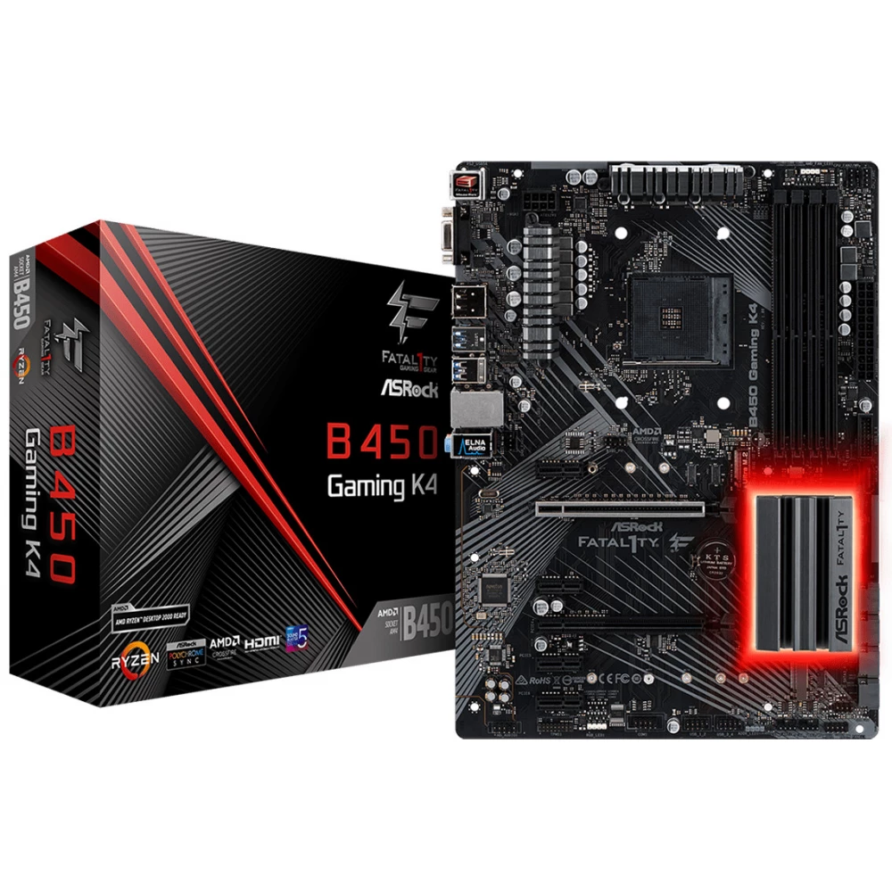 ASROCK Fatal1ty B450 Gaming K4 típusú alaplap Socket-AM4 foglalattal, AMD B450 chipsettel, Processzorban integrált videokártyával, 4 darab DDR4 memóriafoglalattal (max 64GB). 6 darab USB 2.0 port, 6 darab USB 3.0 port, 2 darab USB 3.1 port.