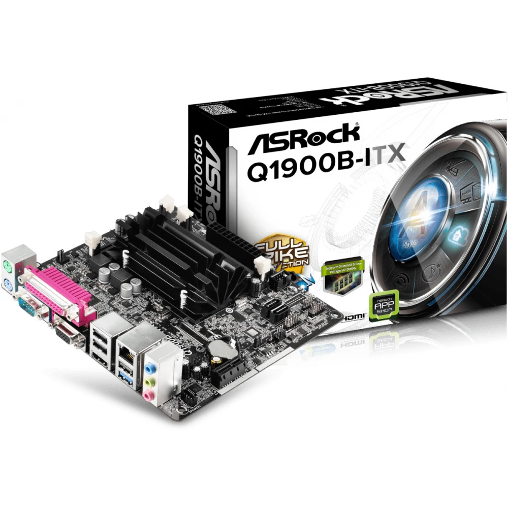 ASROCK Q1900B-ITX típusú alaplap Intel Celeron J1900 2.00GHz processzorral, Intel Processzorba integrált chipsettel, Intel HD Graphics (2/3/4/5/6000) integrált videokártyával, 2 darab Notebook DDR3 (SO-DIMM) memóriafoglalattal (max 16GB). 5 darab USB 2.0 port, 1 darab USB 3.0 port.