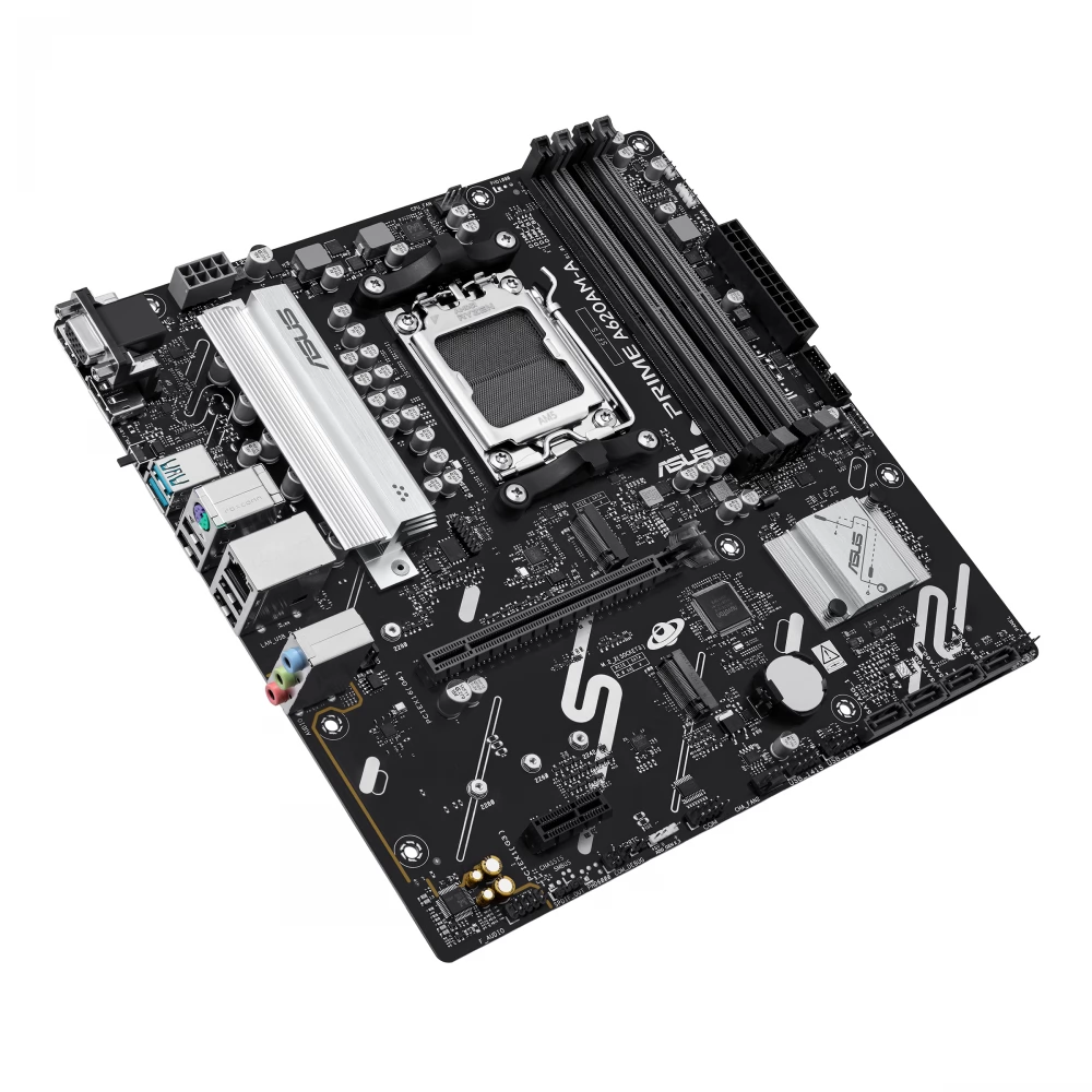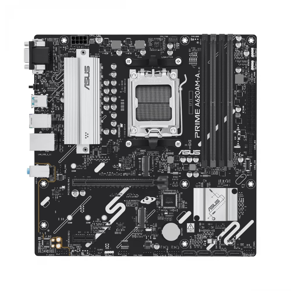 ASUS PRIME A620AM-A-CSM típusú alaplap Socket-AM5 foglalattal, AMD A620A chipsettel, Processzorban integrált videokártyával, 4 darab DDR5/CUDIMM memóriafoglalattal (max 256GB). 8 darab USB 2.0 port, 5 darab USB 3.0 port.