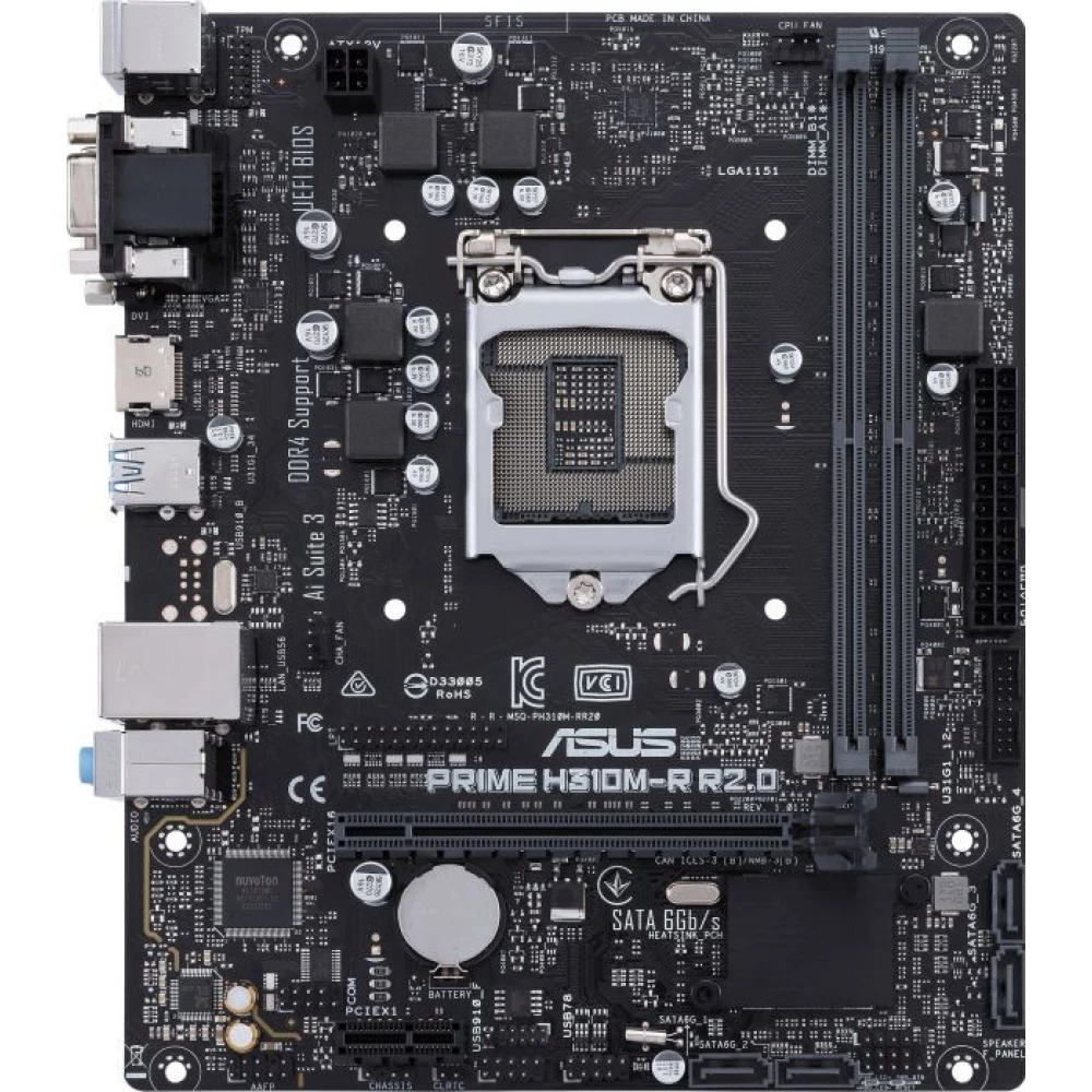 ASUS Prime H310M-R R2.0 típusú alaplap LGA-1151 (300) foglalattal, Intel H310 chipsettel, Processzorban integrált videokártyával, 2 darab DDR4 memóriafoglalattal (max 32GB). 6 darab USB 2.0 port, 4 darab USB 3.0 port.
