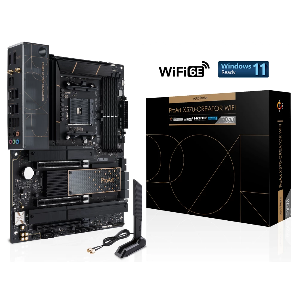 ASUS ProArt X570-CREATOR WIFI típusú alaplap Socket-AM4 foglalattal, AMD X570 chipsettel, Processzorban integrált videokártyával, 4 darab DDR4 memóriafoglalattal (max 128GB). 6 darab USB 2.0 port, 6 darab USB 3.0 port, 5 darab USB 3.1 port.