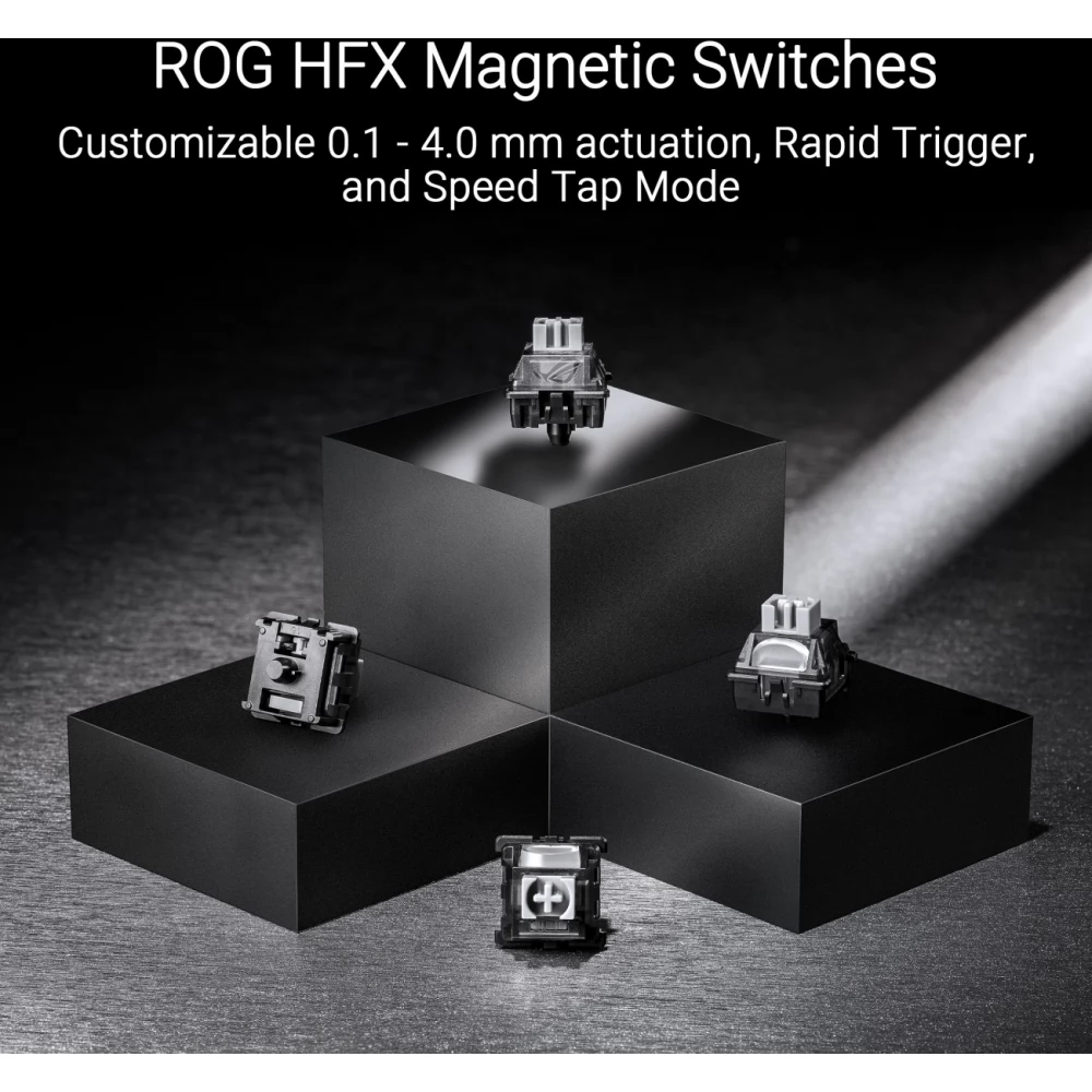A ROG HFX mágneses kapcsolók átkapcsolási pontja 0,1 és 4,0 mm között állítható, hogy mindenféle gépelési elvárásnak meg tudjon felelni. Az átkapcsolási pont egy többfunkciós gombbal és egy érintőpanellel, vagy az Armoury Crate szoftverrel állítható be.