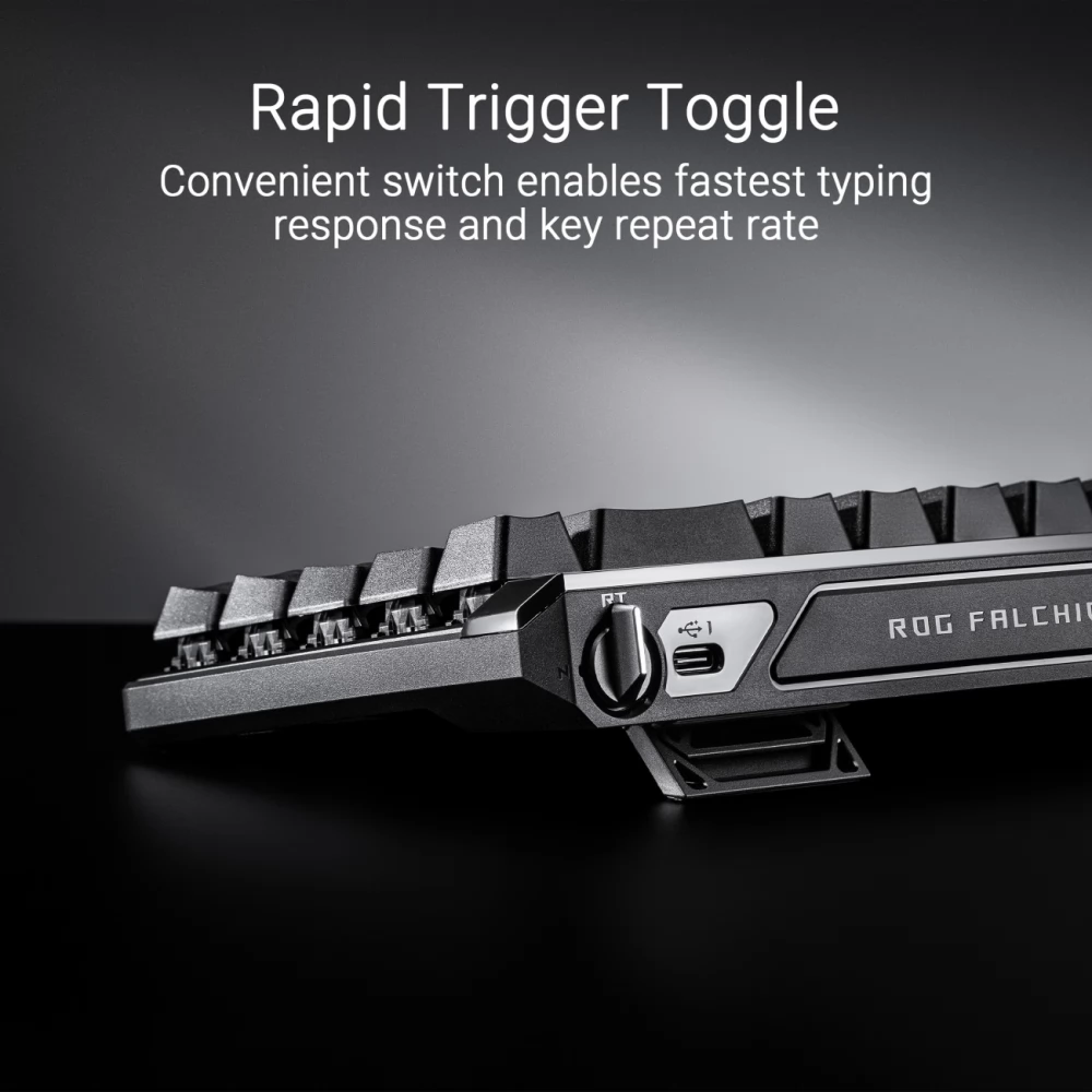 A ROG Falchion Ace HFX jobb felső hátsó paneljén található dedikált váltókapcsolóval aktiválható Rapid Trigger funkció a lehető legrövidebb gépelési válaszidőt nyújtja, ezzel lehet a leggyorsabban egymás után gombnyomásokat ismételni. Alapértelmezésben amikor a funkció aktiválva van, csak a WASD gombokra érvényes. A többi gombra a Rapid Trigger az Armoury Crate-ben kapcsolható be.