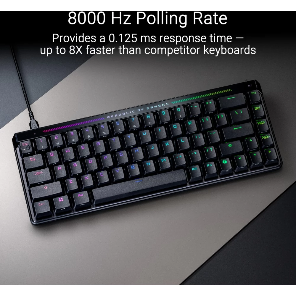 A ROG Falchion Ace HFX egy kompakt, 65%-os analóg gamer billentyűzet ROG HFX mágneses kapcsolókkal, személyre szabható (0,1 és 4 mm közötti) átkapcsolási távolsággal és dedikált Rapid Trigger váltókapcsolóval a leggyorsabb gépelési válaszidő eléréséhez. A 8000 Hz-es lekérdezési gyakoriság kimagasló válaszkészséget garantál, és ezzel a Falchion Ace HFX számottevően gyorsabb lehet, mint a versenytárs billentyűzetek.
