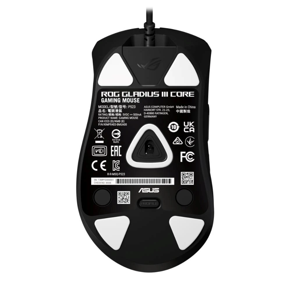A ROG Gladius III Core egy 72 grammos, vezetékes gamer egér ergonomikus formával, amely 12 000 dpi-s optikai érzékelővel, ROG Micro Switch II kapcsolóval, ROG Push-Fit kapcsolófoglalatokkal, ROG Paracord kábellel és 100% PTFE egértalppal van felszerelve.