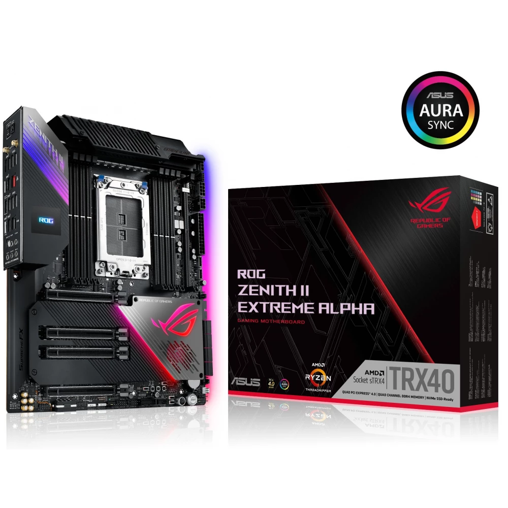 ASUS ROG Zenith II Extreme Alpha típusú alaplap Socket-TRX4 foglalattal, AMD TRX40 chipsettel, Processzorban integrált videokártyával, 8 darab DDR4 memóriafoglalattal (max 256GB). 3 darab USB 2.0 port, 8 darab USB 3.0 port, 9 darab USB 3.1 port.
