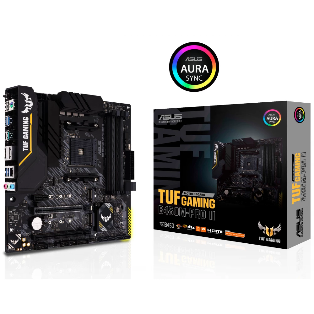 ASUS TUF GAMING B450M-PRO II típusú alaplap Socket-AM4 foglalattal, AMD B450 chipsettel, Processzorban integrált videokártyával, 4 darab DDR4 memóriafoglalattal (max 128GB). 6 darab USB 2.0 port, 6 darab USB 3.0 port, 2 darab USB 3.1 port.