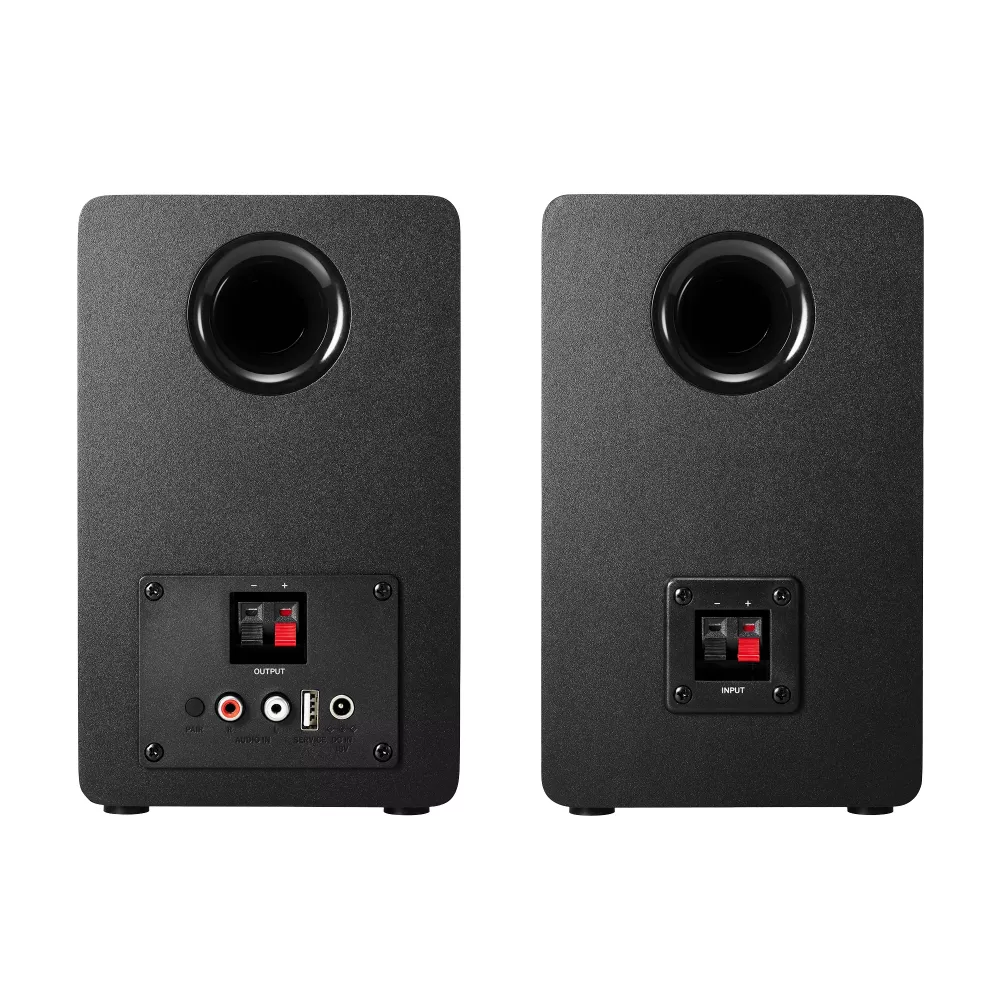 A mellékelt AC adapterrel (amely háromféle villásdugó adaptert tartalmaz a nemzetközi használathoz) és egy hosszú, 2.0 m-es hangszórókábellel csatlakoztatva a hangszórók könnyen beállíthatók és használhatók bármilyen térben – nem igényelnek külső vevőegységet vagy erősítőt. A források közvetlenül a hangszórók kettős RCA csatlakozójához vagy vezeték nélkül, Bluetooth® technológián keresztül csatlakoztathatók. A LED visszajelzővel ellátott bekapcsológombbal és a hangerőszabályzó forgógombbal a kezelés végtelenül egyszerű.