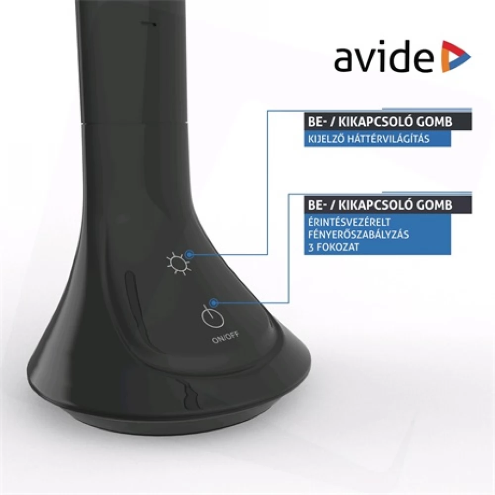 Biztosítson fényt íróasztalán az Avide 5W-os kijelzős asztalilámpájával. A lámpa egyszerű, minimalista kialakításával, igazán modern hatást biztosít helyiségeinek. A beépített akkumulátornak köszönhetően akár 4 órán át használhatjuk töltés nélkül. A termék elérhető fehér, illetve fekete színekben.