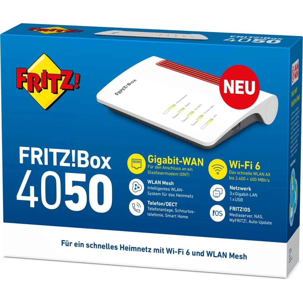 Az AVM FRITZ!Box 4050 egy professzionális fiber optikai router, amely kifejezetten üvegszálas internetkapcsolatokhoz készült. Gigabit WAN porton keresztül csatlakoztatható a glasfaser ONT-hez, így maximális sebességet biztosít.