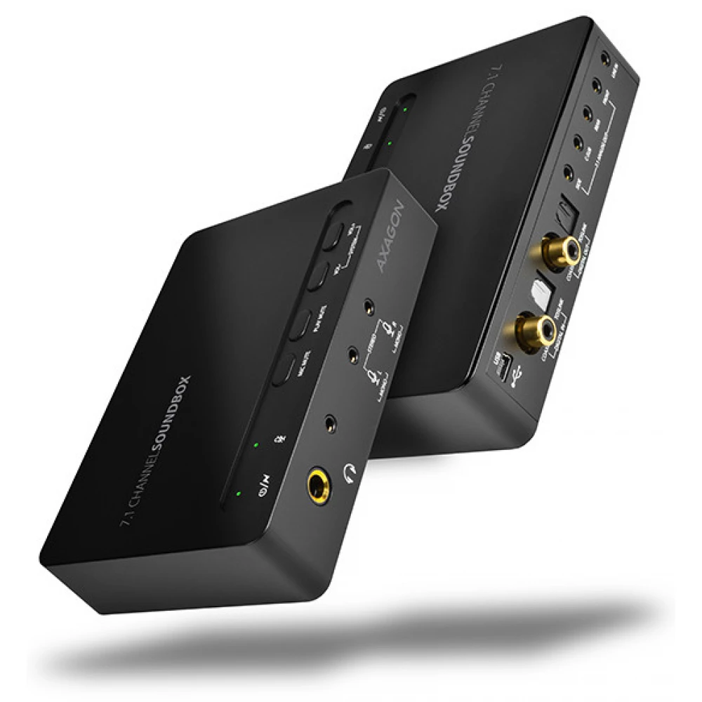 Az AXAGON ADA-71 SOUNDbox külső 7.1-es USB hangkártya felruházza a számítógépet surround hangzással, valamint számos hangbemenettel és kimenettel.