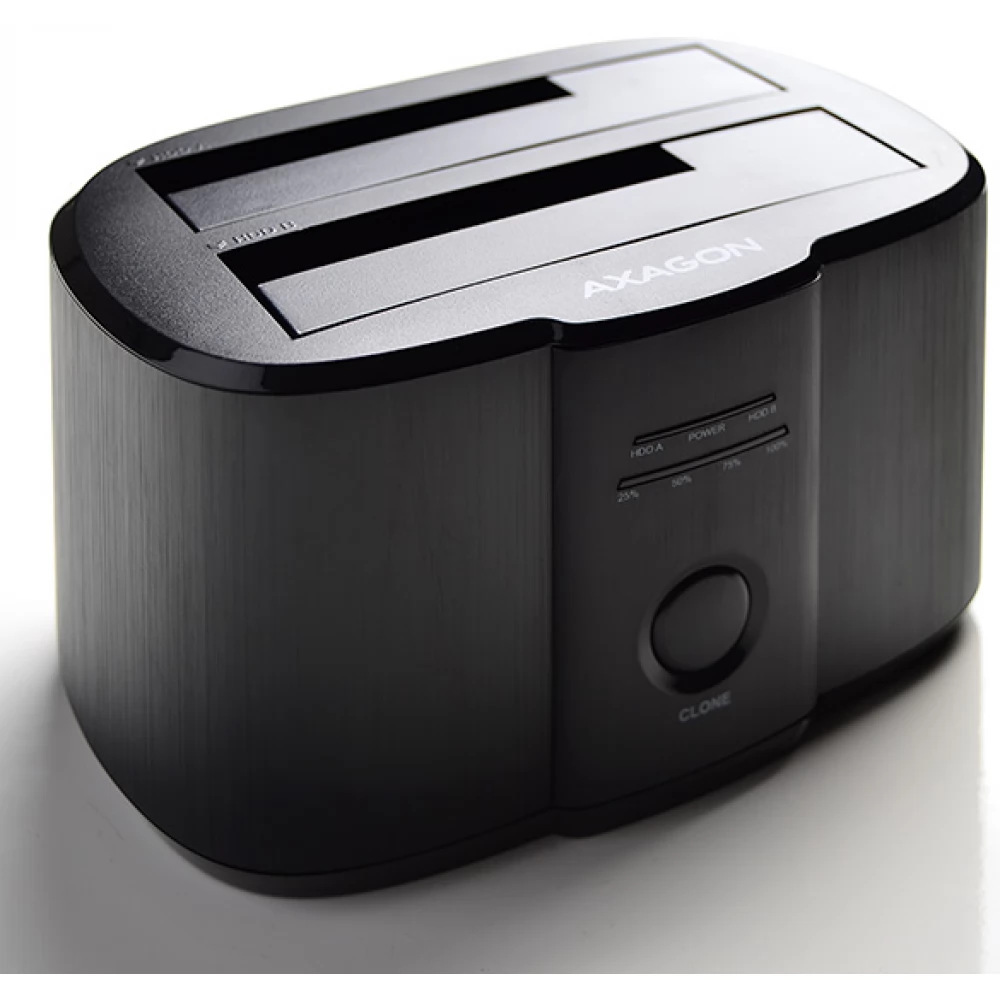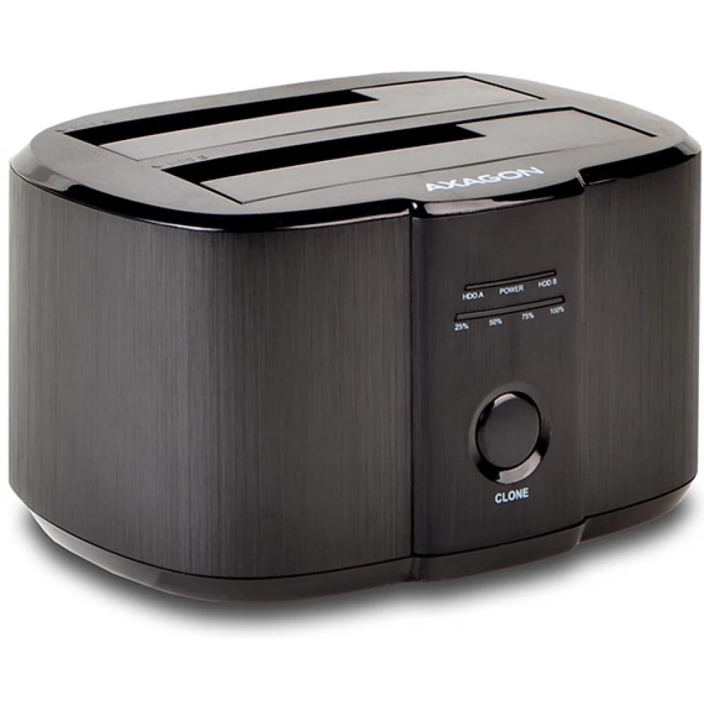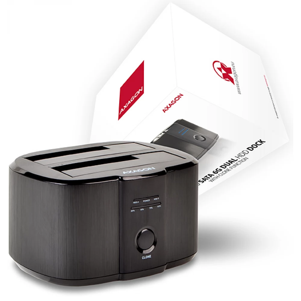 Az AXAGON ADSA-ST DUAL SuperSpeed USB 5 Gbps dokkoló/klónozó állomás gyorsan és egyszerűen csatlakoztat bármilyen SATA-meghajtót vagy akár két meghajtót egyszerre a számítógéphez. A dokkoló USB-B csatlakozója a mellékelt USB-B <-> USB-A kábellel együtt lehetővé teszi a számítógéphez való csatlakozást.