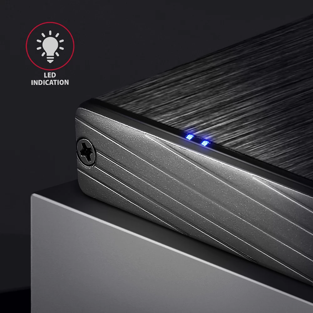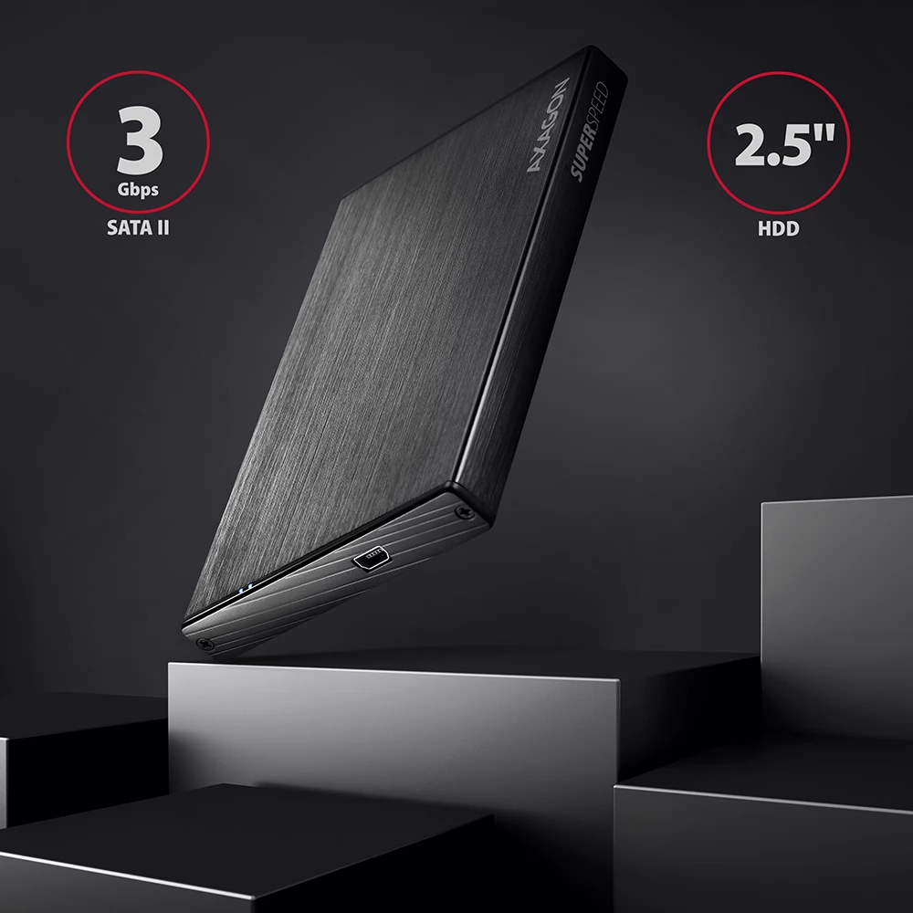 A kompakt alumínium külső AXAGON EE25-XA3 ALINEbox tok nagy sebességű USB 3.2 Gen 1 (USB 3.0) interfésszel 2.5" SATA merevlemezek számára készült.