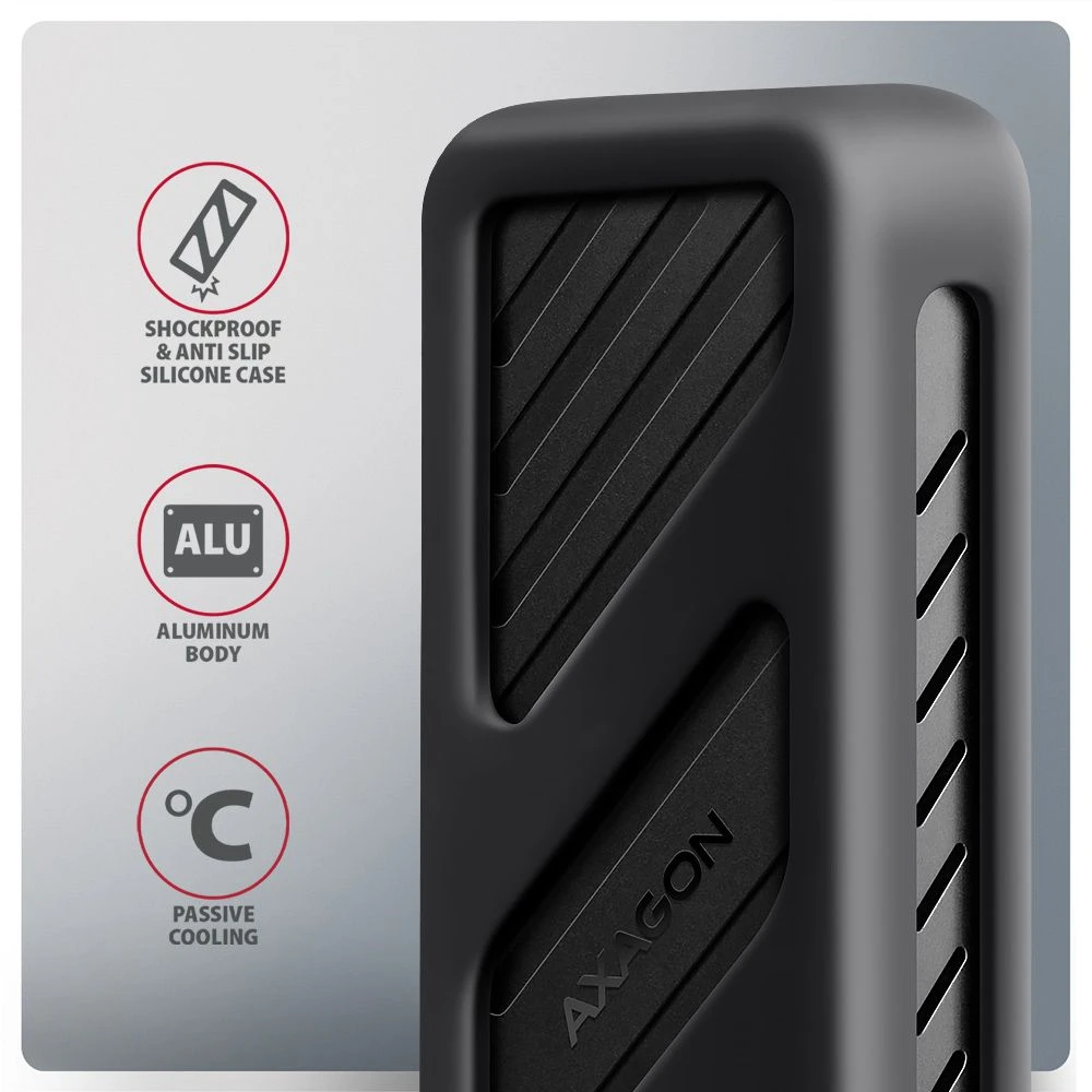 Az alumínium ház és a hővezető pad kiváló hűtést biztosít az M.2 SSD számára. Az oldalsó szellőzőnyílások elegendő légáramlást tesznek lehetővé, ami meghosszabbítja a ház élettartamát és megakadályozza az SSD sebességcsökkenését („Thermal Throttling”). A szilikon védőtok további védelmet nyújt az ütések ellen, megakadályozza az asztalon való elcsúszást, és kényelmes fogást biztosít. A fém ház elegáns fekete színű, amely ellenáll az ujjlenyomatoknak.