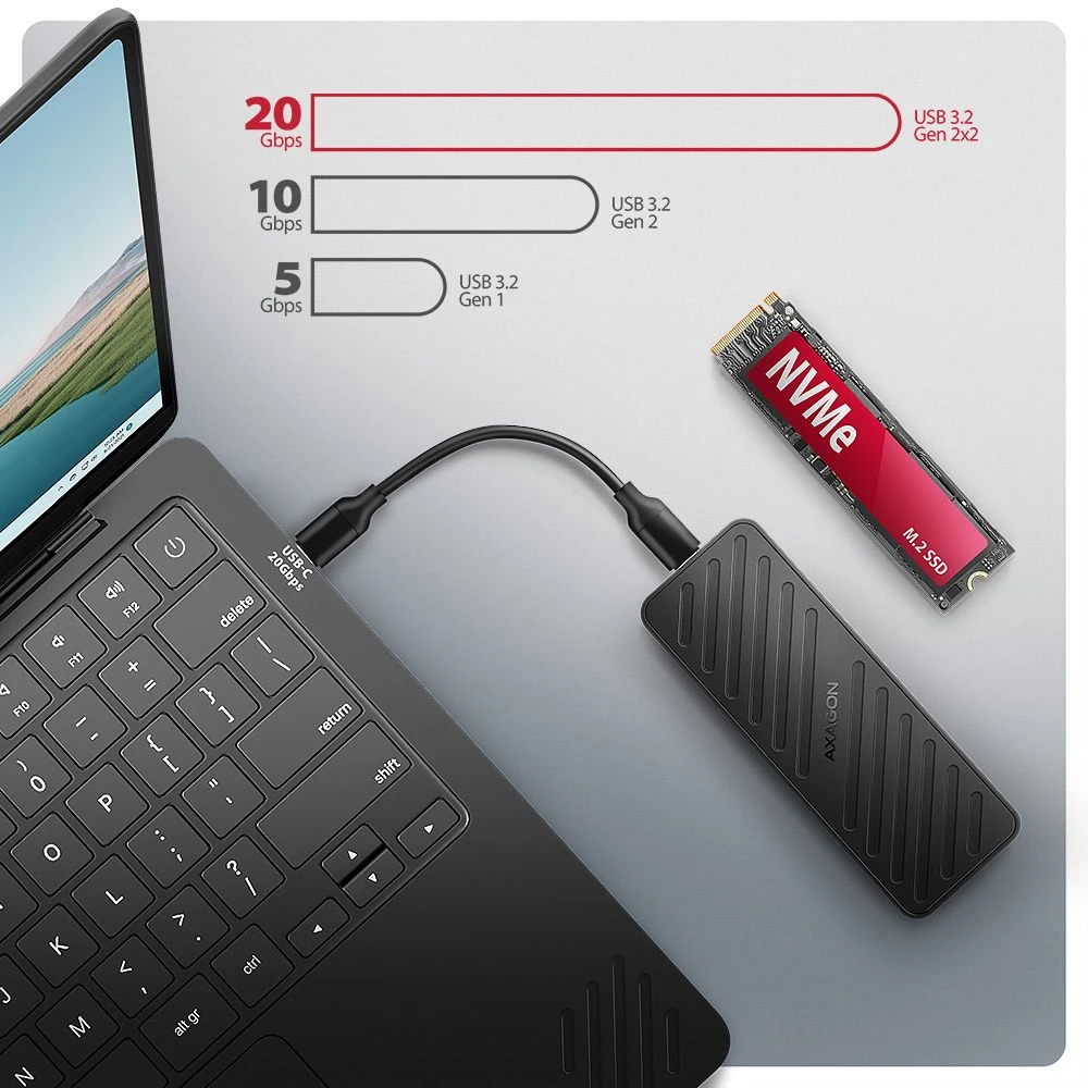 Az USB 20Gbps interfésznek köszönhetően az átvitel sebessége akár 20 Gb/s is lehet. A ház maximális sebességének kihasználásához az eszköz vezérlőjének kompatibilisnek kell lennie az USB 3.2 Gen 2x2 szabvánnyal. Ezek a vezérlők jellemzően játékhoz tervezett laptopokban és modern asztali számítógépekben találhatók. Az M.2 külső ház modern funkciókat is támogat, például UASP, TRIM és S.M.A.R.T. állapotfigyelés, valamint üresjárati üzemmódban készenléti támogatást is nyújt.