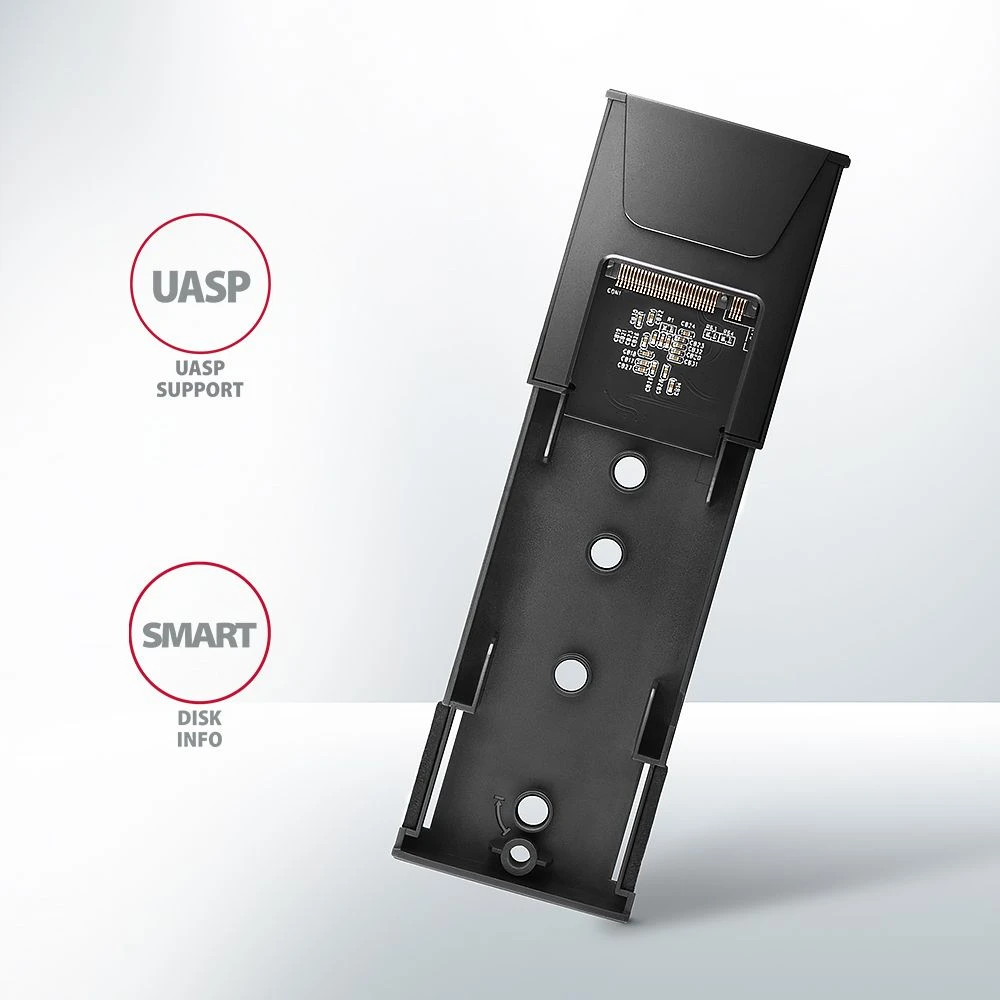 Az új lapkakészletnek köszönhetően egyedülálló funkció az M.2 NVMe és SATA lemezek használatának lehetősége. Nem kell azon gondolkodnia, hogy milyen típusú M.2 lemez kerüljön a dobozba. Előnye a négy különböző hosszúságú SSD-kártya - 30, 42, 60 és 80 mm - rögzítése. Az M.2 kártyák lehetnek egyoldalúak vagy kétoldalúak. A boxba helyezhető SSD lemezek száma nem korlátozott.