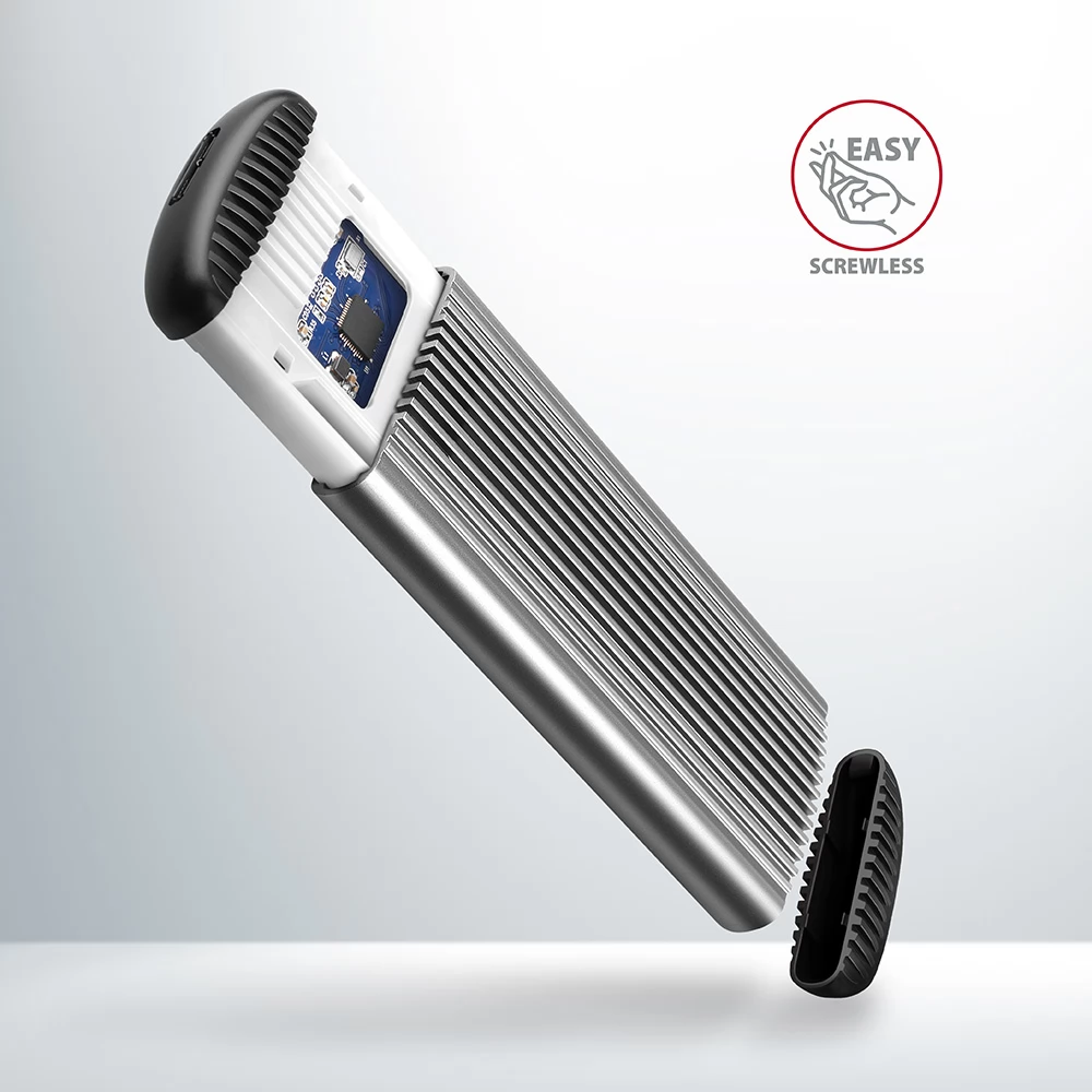 A doboz csavar nélküli nyitása megkönnyíti az M.2 SSD lemez össze- és szétszerelését. A lemezcsere gyors és egyszerű, így bővülnek a doboz felhasználási lehetőségei pl. adatmigrációhoz, teszteléshez stb.