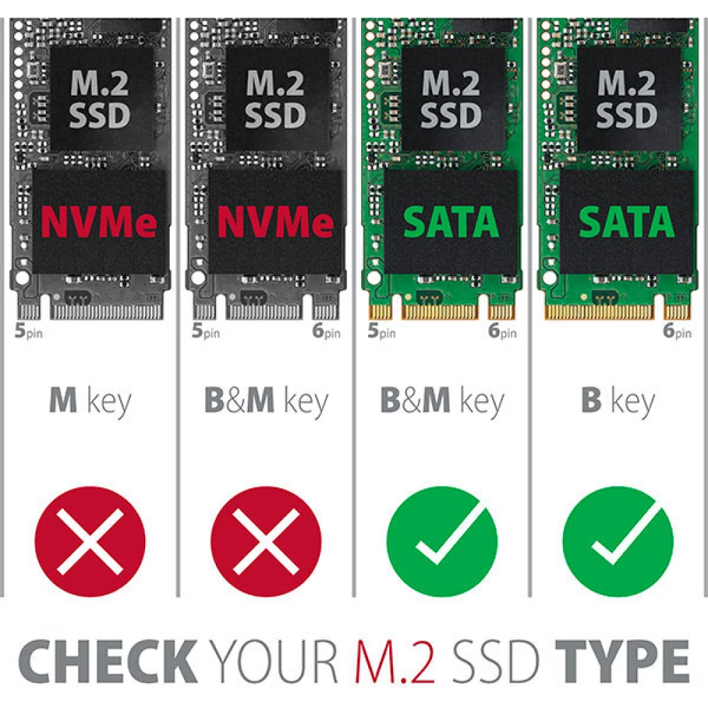 A külső házhoz akár 22x80 mm méretű SATA M.2 SSD meghajtók is használhatók. A ház korlátlan SSD meghajtó kapacitással rendelkezik. Az M.2 kártyák egy- vagy kétoldalasak is lehetnek.