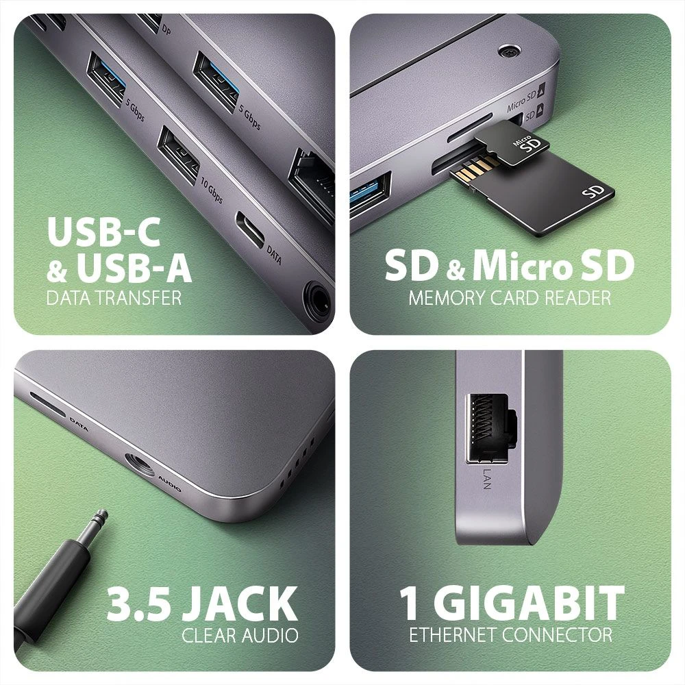 Az USB-hub három USB-kimenetet kínál szabványos USB-A csatlakozóval. Kettő 5Gbps sebességgel, egy harmadik pedig 10Gbps sebességgel az igényesebb eszközök számára. Rendelkezik továbbá egy 10Gbps sebességű USB-C adatporttal is. A hub egyszerre két külső meghajtó állandó csatlakoztatására is képes. A gyors USB 3.2 Gen 2 interfésznek köszönhetően az átviteli sebesség akár 10Gb/s is lehet.